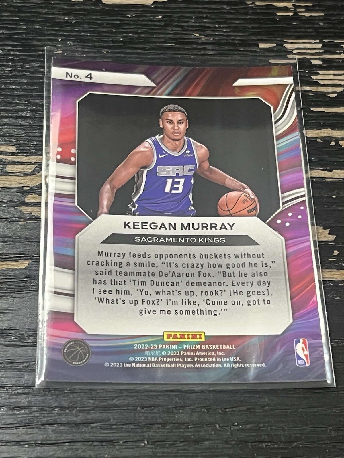 This is a rare 2022-23 Panini Prizm Instant Impact trading card featuring Keegan Murray, a rising star in the National Basketball Association (NBA). The card is in excellent shape and has been well-preserved, making it an ideal addition to any collection. It has a card number of 4 and is a rookie card, which adds to its value and appeal. The card is ungraded, but its quality is evident in its features, such as the Impact parallel/variety and the Sacramento Kings team designation. This card is a must-have for any serious basketball card collector.