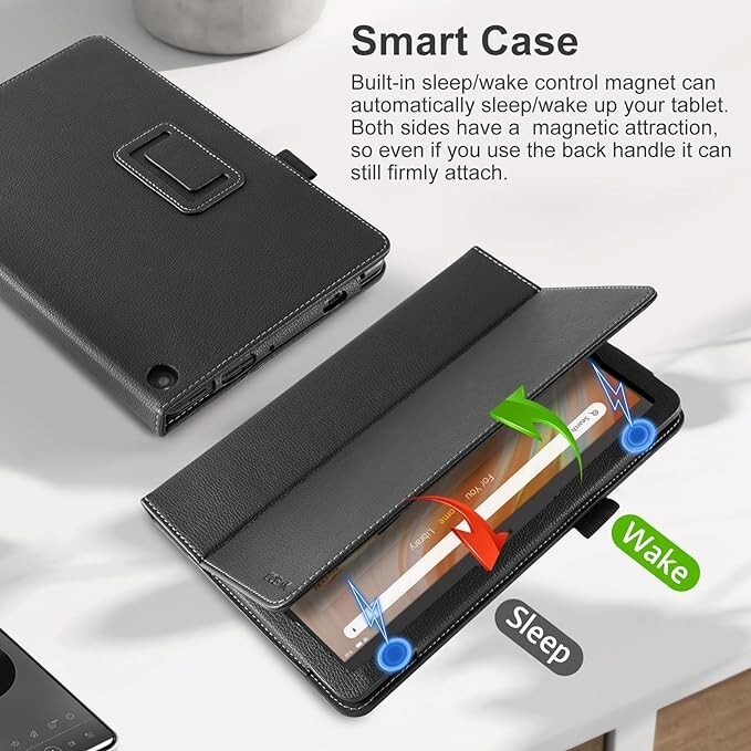 ONLY FIT: So many customers have got this wrong. Please BEWARE that the protective case do NOT fit older Fire 10 models. The case is specially designed for Amazon All-New Kindle Fire HD 10 Tablet (Generation 13th, 2023 Release). To confirm the device model before purchasing is highly recommended! FEATURES: The case is constructed from a single piece of polyurethane to protect the front and back of your device. And the interior Hand Strap gives you a comfortable single-handed use experience. VIEWING ANGLES: The foldable front cover supports 30-degree and 60-degree standing angles. You can easily fold the Smart case into different positions to create a stand for reading, viewing, typing, or making video calls. AUTO WAKE/SLEEP: The magnetic fire hd 10 case automatically wakes your device when opened and puts it to sleep when closed. And the magnetic closure keeps the cover securely closed, protecting your device from dropping out.