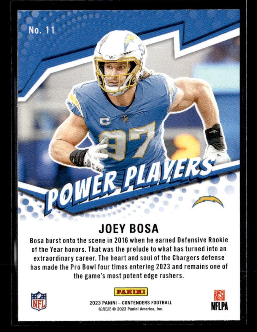 Welcome to our eBay store. Check out all our eBay items and check back often as we will be adding new cards daily. We ship each day so your order will be shipped promptly. We use top loaders or plastic boxes shipped in padded envelopes or cardboard boxes - whatever is appropriate. Pictures: Many of our pictures are stock photos. If you need to see a scan of the exact card you will receive, please email us before buying. If a card is serial numbered, we are not selling a specific serial number, unless the exact serial number is listed in the title. If our pictures does not match the description, the description is probably correct and photo incorrect - please let us know so we can get it fixed. USA shipping on singles is a flat fee - you can buy as many singles as you want for the one fee (does not include sets, boxes, or lots as these go by weight and your location). International shipping on singles is a FLAT fee - you can buy as many singles as you want for the one shipping fee (does not include sets, boxes, or lots as these go by weight and location). To get combined shipping, all cards must be paid for in 1 payment. You may have to wait to get a combined invoice if it did not combine automatically. We send out invoices each morning or ASAP upon request. Our online store hours are 6am to 4pm, Central Time, Monday through Friday. We answer your email during that time ASAP. 2023 Panini Contenders Power Players #11 Joey Bosa - FB Front Back Sport: Football Set: 2023 Panini Contenders Power Players Year: 2023 Item#: 11 Player: Joey Bosa Team: Los Angeles Chargers Brand: Panini Contenders Manufacturer: Panini Group Grading Company: Raw Grade SetType: Insert Item Condition: Near Mint/Mint 2014 Beckett Collectibles, LLC. All Rights Reserved Powered by: