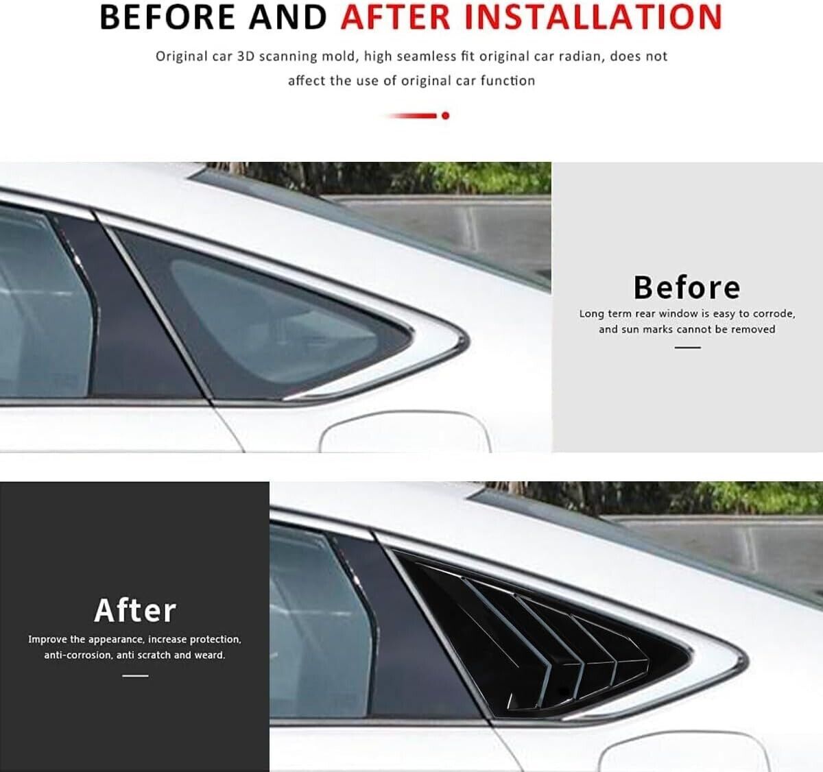 These Honda Accord rear window louvers give my car such a sleek, sporty look! The ABS plastic feels high-quality and sturdy—no cheap, flimsy plastic here. Installation was a breeze with the included tape; no tools needed and they stay securely in place. The glossy finish perfectly matches my car’s style. A must-have for 2023-2024 Accord owners who want that aggressive yet stylish upgrade!