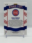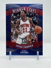 Up for sale is a 2023-24 Donruss Optic NBA Isiah Thomas Winner Stays Insert #14 sports trading card. This original and licensed reprint card features a short print and is a chase card for fans of the Detroit Pistons. The card is made of paperboard, aluminum, card stock, paper, plastic, and metal with a thickness of 20 Pt. It is a standard size card and is in excellent condition. The card is perfect for fans of the National Basketball Association (NBA) who are looking to add a unique piece to their collection. The card is manufactured by Panini and is in the English language.