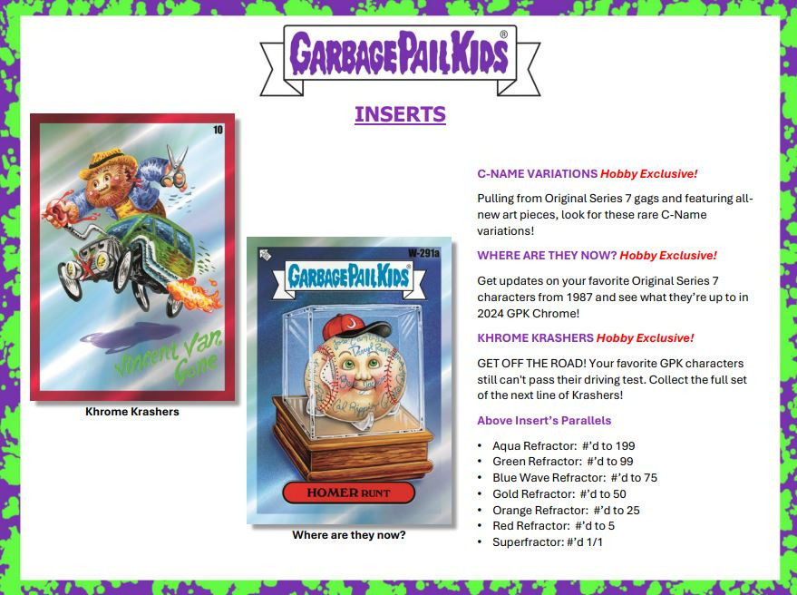ebay template Sticky NIKKI - 2024 TOPPS GARBAGE PAIL KIDS CHROME 7 Hobby 6X Box BREAK #1 Description NO PURCHASE NECESSARY. See full rules at https://ebaycasebreaks.com/entrants Thank you for checking out Northof7cards Group Breaks - Break and Product Info Below. We are happy to let you know that we will now also be streaming our break simultaneously on 3 Media platforms. Please search for the name Northof7cards YouTube Twitch Twitter We have a backup for our YouTube channel called Northof7cardsBackup, you can visit it incase our regular YouTube gives us trouble in the future. If you are not able to be there live with us, do not worry as a copy of the break will be uploaded on our YouTube & Twitch channels. BY BIDDING YOU AGREE THAT YOU HAVE READ AND UNDERSTAND WHAT A BOX BREAK IS! PLEASE be sure to read ALL of the description before bidding. If you have any questions about what has been stated, do not hesitate to contact us BEFORE bidding. If you do not understand this, PLEASE DO NOT BID!!! By bidding on this auction, you agree that you understand what has been stated and understand how a box break is conducted. We make no guarantees on the fulfillment of redemptions by the manufacturer. As per eBay policy we are required to close all auctions that are paid as shipped even though you may have not received any hits. Feedback does not indicate whether you have received goods. ** YOU ARE NOT bidding on any sealed product and no hits are guaranteed, SOME Teams MAY HIT A FEW , OTHERS MAY HIT 0. YOU ARE bidding on the Team explicitly named in the title We are Opening 2024 TOPPS GARBAGE PAIL KIDS CHROME 7 Hobby Half Case 6X Factory Sealed Boxes Player Break please see item description below Break Time: March 7th @ 4:00 PM EST All Cards Ship DESCRIPTION: Each pack contains four (4) 2024 Garbage Pail Kids Chrome 7 base cards. Each box contains four (4) sequentially numbered parallels. Each case contains one (1) sketch card. BOX/CASE PACK: Twelve (12) boxes per case Twenty-four (24) packs per box Four (4) cards per pack PLEASE BE AWARE THAT OCCASIONALLY WE SHIP BIG HITS ASAP BEOFRE THE REST OF THE BREAK GETS SHIPPED. AS A RESULT YOUR ORDER MAY COME IN MULTIPLE PACKAGES. In the event that a card has multiple players. In these cases, each player on the card will be added to Random.org and be randomized 5 times and the team on the top of the list will receive the card. All breaks will occur as scheduled. However, extreme changes in weather or manufacturer/distributor shipping delays may force us to postpone breaks to a later time or day. All Auctions must be paid for immediately after the end of the auction, or we hold the right to cancel or resell your spot to the next highest bidder. If this is not complete within the given time then you can be subject to being blocked from future purchases. All 0 feedback users must contact us before bidding, if a 0 feedback user wins an item and does not pay immediately their item will offered to the next highest bidder. We do combine shipping, our price is $3.75 for the first slot and $1.25 for every additional slot within the United States. For Canadian and International residents, shipping is $8.95 for the first spot and $1.25 for every additional spot. Please contact us if you want shipping to Asia for a quote. If you are part of the eBay International Shipping Program, please be aware that ebay sends you invoices directly. We cannot change or send you combined invoices as ebay will not allow us to. We like to ship our breaks as fast as possible so please understand that we sometimes ship breaks individually. So please do not worry if you see a package with one break inside when there were multiple breaks on your invoice. ALL CANADIAN BUYERS WILL NOW GET TRACKING Customs, Duties, Sales Taxes and VAT’s are charged by local governments of some countries. Please check with your local customs office for further information. We are not responsible for these charges. If a large number of players for this break are not filled, we hold the right to cancel the break. ---------------------------------------------------------------------------------------- ------------------------------------------------------------------------------------------------------- “ NO PURCHASE NECESSARY . O pen to legal residents of the 50 U.S./ D.C. and Canada (excluding Quebec) , age 18+ and age of majority. Void outside 50 U.S. and Canada and where prohibited. Sweepstakes starts 08/01/24; ends 08/31/24 . Total ARV of all prizes: Odds will depend on the number of eligible entries received. Limit: Eight (8) entries per household. For full Official Rules or how to enter, visit US: https://www.ebay.com/srv/ survey/a/verticals. collectibles.sweepstakes Canada: https://www.ebay.ca/ srv/survey/a/verticals. collectibles.sweepstakes FAQs Payment Shipping Return FAQs Our checkout system is automated and leaves feedback automatically once received. Payment Ebay Managed Payment Shipping International Shipping Customs Duty is charged by local governments of some countries and those are buyer's responsibility. Please check with your local customs office for duties and taxes. Returns We do not accept returns on breaks North-of-7 ©2019 Sell Smarter with Kyozou. Inventory and Ecommerce Management