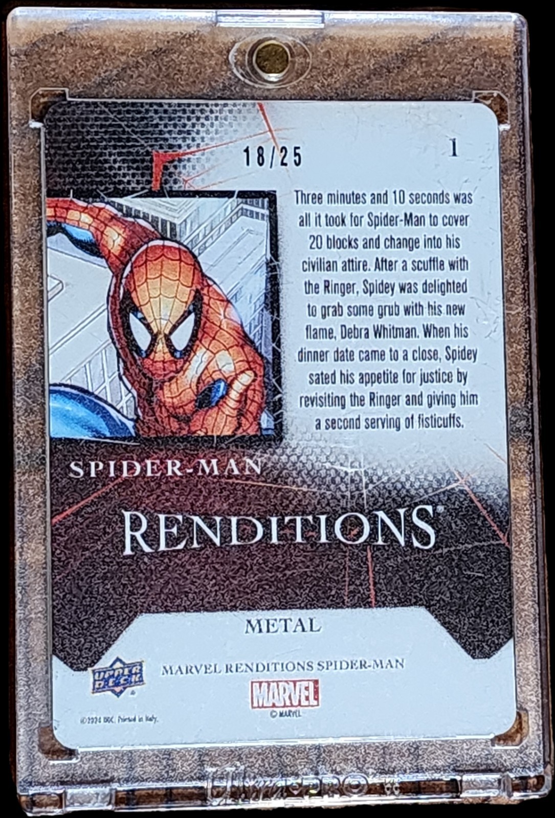 For sale is a 2024 Upper Deck Marvel Renditions Spider-Man – METAL parallel, serial-numbered 18/25. ✔ Spider-Man (Peter Parker) ✔ Renditions METAL parallel ✔ Limited to /25 ✔ 2024 Upper Deck Marvel release WHY THIS CARD IS DESIRABLE: Extremely low-numbered Spider-Man card Premium metal finish Popular Renditions artwork from 2024 CONDITION: Card appears in excellent condition. Stored securely in a magnetic one-touch case. SHIPPING: Ships safely with tracking in a bubble mailer.