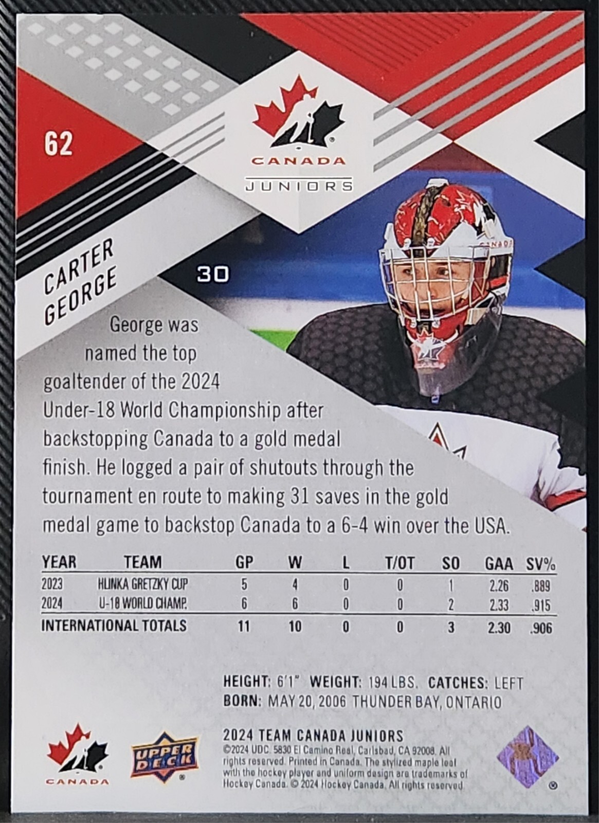 Capture the spirit of junior ice hockey with the 2024-25 Upper Deck Team Canada Juniors card featuring player Carter George. As a promising talent for the Los Angeles Kings and Team Canada, George's card is a must-have for fans and collectors alike. This base set card, number 62, showcases George in action during the 2024 season, reflecting his dedication and skill on the ice. Crafted by Upper Deck, a trusted name in sports memorabilia, this card is part of the exclusive 2024 Upper Deck Team Canada Juniors set. It highlights the athlete in his National Hockey League (NHL) gear, making it a valuable piece for any collection. Although not autographed, the card's authenticity and representation of a rising star in the sport make it a prized item for enthusiasts of ice hockey and sports trading cards. Welcome to Card Crack Chronicles! Shipping Details Within Canada: All cards are shipped in a penny sleeve and toploader for maximum protection. To the USA: Cards are shipped in a penny sleeve only (no toploader due to customs regulations), but rest assured, they'll have extra protection. Important: You will receive the exact card pictured in the listing. Shipping Methods: Canada: Lettermail: $2.99 for the first item, plus $0.25 for each additional card in this listing. Expedited (with tracking): $7.99 for the first item, plus $0.25 for each additional card in this listing. United States: Standard Shipping: $4.99 for the first item, plus $0.25 for each additional card in this listing. Tracked Lettermail: $11.99 for the first item, plus $0.25 for each additional card in this listing. Local Pickup: Available for buyers in or around the Hamilton, Ontario area. Additional Information: Items will be shipped via Canada Post within two business days after receiving cleared payment. Please make your payment within two days of purchase. Stock updates happen often, so be sure to watch this listing for your future needs. Don't forget to check out our other listings?new items are added daily! Thank you for choosing Card Crack Chronicles!