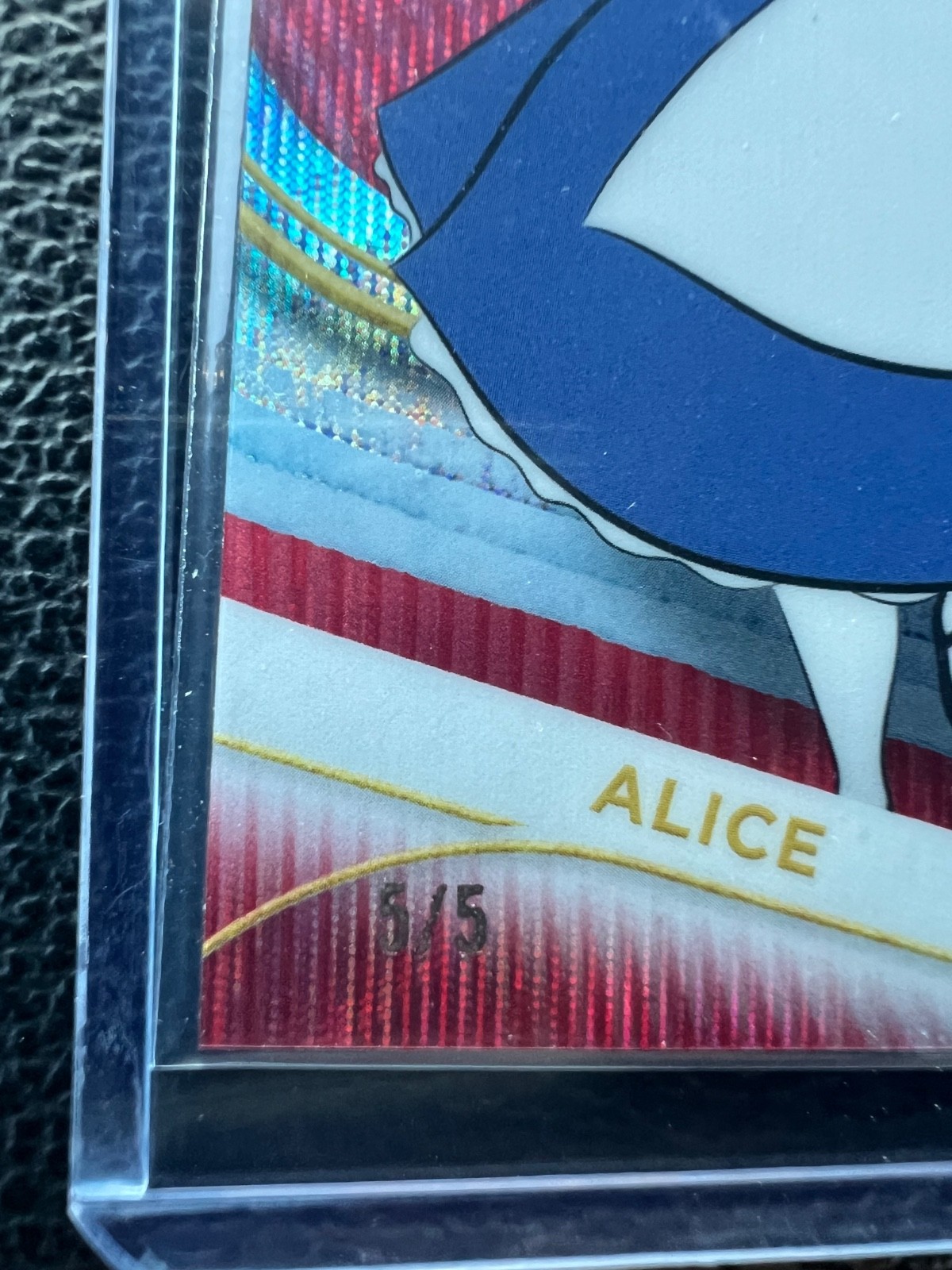 The 2025 Disney Topps Chrome Alice Red Wave trading card is a rare and collectible item limited to only 5 copies. This highly sought-after card features the beloved Disney character Alice in a vibrant red parallel variety. Manufactured by Topps and part of the Disney franchise, this non-sport trading card is sure to be a valuable addition to any collection, making it a desirable piece for fans and collectors alike.
