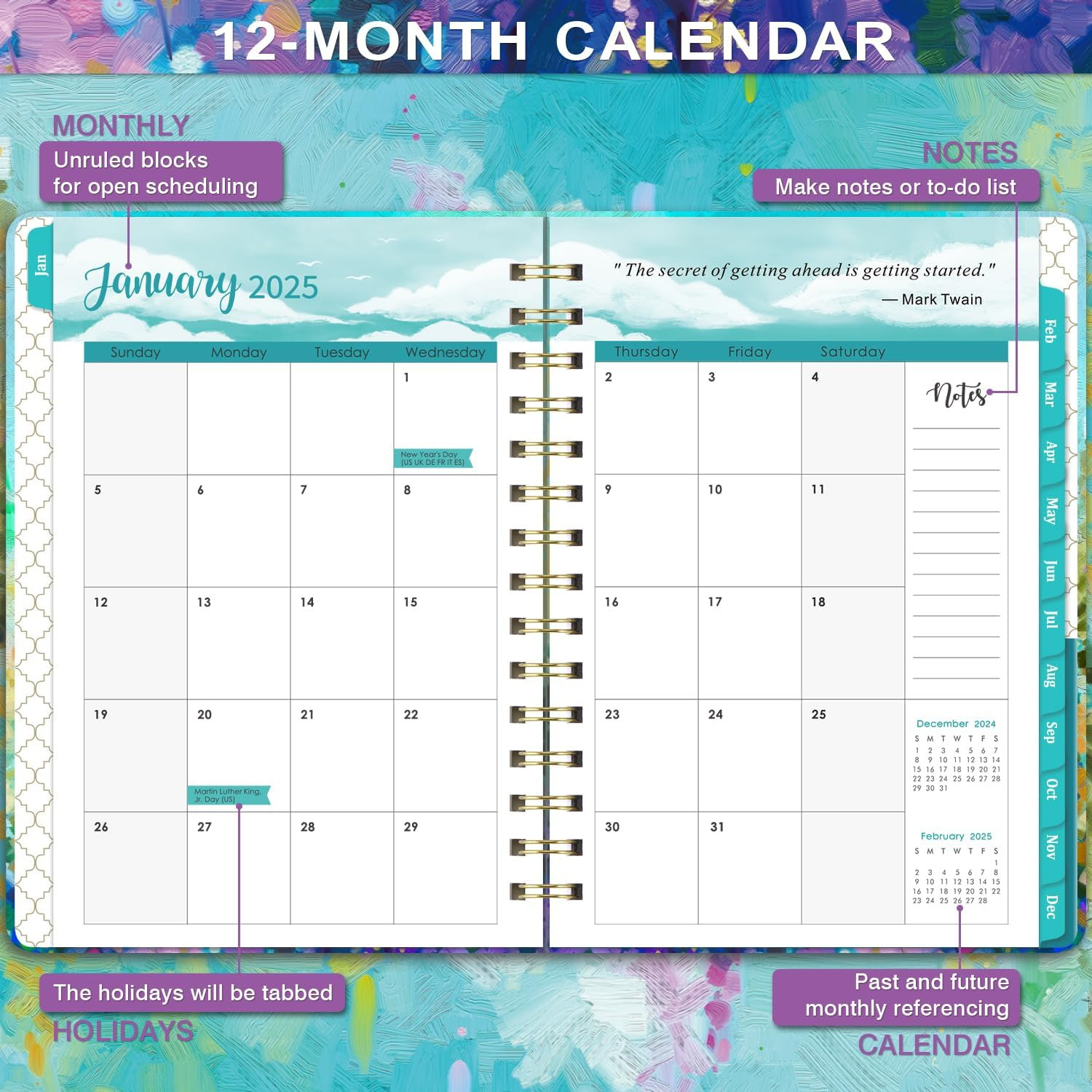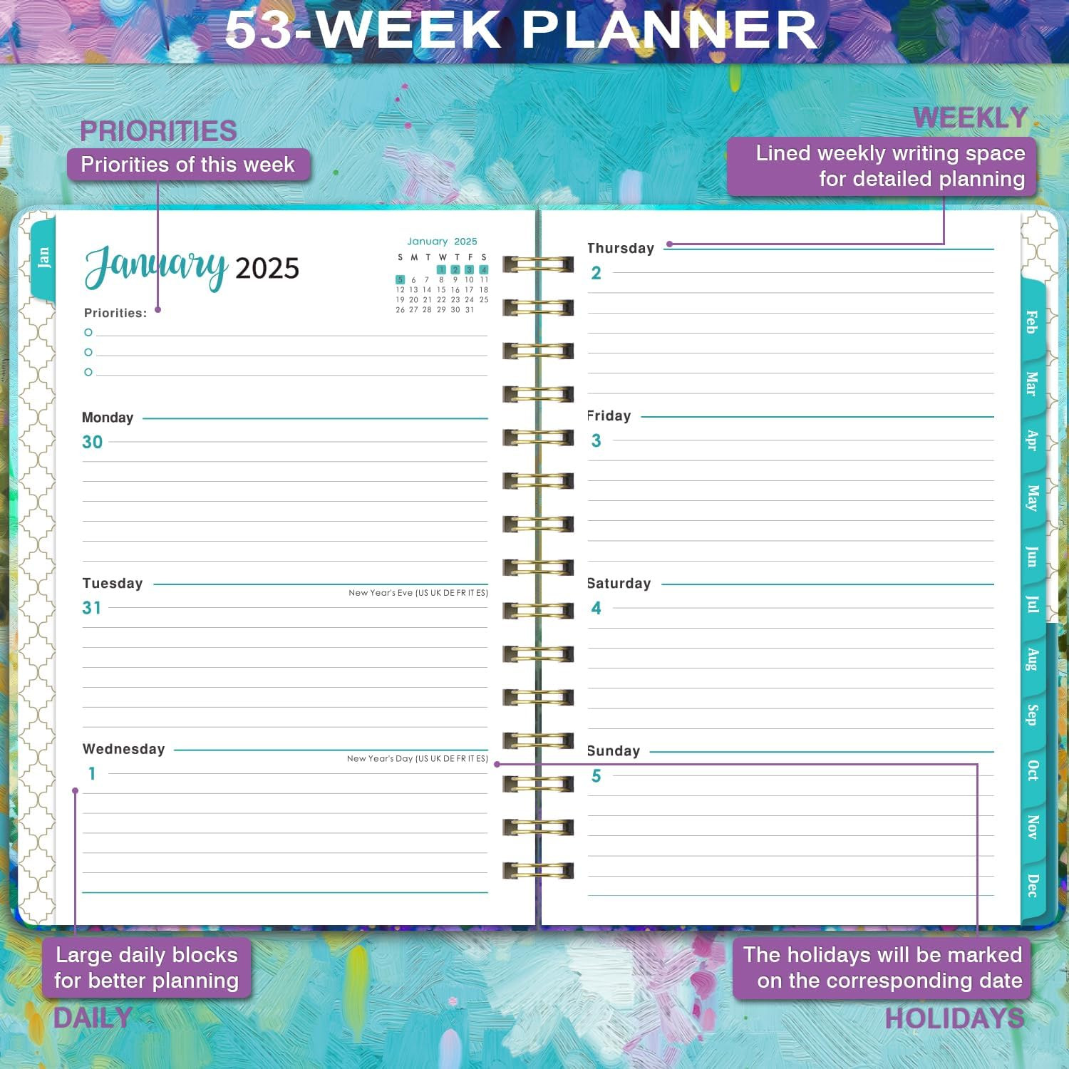 Planner 2025-2025 Planner, JAN.2025 - DEC.2025, 2025 6.3" x 8.4", x 8.4" Product Details Manufacturer: Artfan Brand: Artfan Item Weight: 5 ounces Product Dimensions: 8.4 x 6.3 x 0.6 inches Item model number: ANA5LZYHZYFX Color: Purple:6.3" x 8.4" Cover Material: Paper Material Type: Cardboard Size: 6.3" x 8.4" Sheet Size: 6.3 x 8.4 Inches Manufacturer Part Number: ANA5LZYHZYFX Brand: Artfan Color: Purple:6.3" x 8.4" Cover Material: Paper Year: 2025 Format: Day to Day Calendar, Organizer Calendar Type: Weekly Target Audience: Adult, Student Sheet Size: 6.3 x 8.4 Inches Material: Cardboard Item Weight: 5 Ounces 2025 Overview - The weekly and monthly planner 2025 measured 8.4''x 6.3'' and featuring 12 months (JAN .2025 - DEC.2025) of weekly and monthly pages, weekly and monthly sections for easy full year planning and scheduling. 6.3" x 8.4" Planner 2025 is easy to use and carry away. Besides, the strong twin-wire binding allows to lay-flat orientation. With weekly and monthly sections for easy planning and scheduling. Monthly View Pages - Each monthly pages of this 2025 planner weekly and monthly contains an overview of the month and a notes section. There are unruled daily blocks + Marked Holidays in each monthly page for your monthly planning. Besides, the Past and Future monthly reference calendar on the page helps for long-term planning and the Notes Section can list your priorities of the month. Weekly View Pages - The weekly view in this weekly and monthly academic planner 2025 is from Sunday to Monday, and this 2025 planner marks every date and major holidays for easily scheduling and planning. Besides, each weekly page offers ample lined writing space for you to write down your details planning. Functional Designs - | Inner Pocket | Elastic Closure | Flexible Hardcover | Strong Twin-Wire Binding | Planning Pages | Premium Thick Paper | Contacts | Quick Reference Information | Yearly Overview | Holidays. PROFESSIONAL CONTENT DESIGN - 12 months of monthly pages with past and future monthly referencing + 12 months of ample lined weekly pages with top priorities section + 2025-2027 calendar overview + 2025-2027 holiday pages + 2 contact pages. This planner 2025 with exquisite cover printing focus on meeting all your needs!