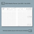 2 PAGES PER WEEK HARDCOVER: Lay flat week-to-view on 2 pages, this weekly planner (Jan 2025 - Dec 2025) presents spacious everyday planning with hourly schedules for your appointments, which makes your busy daily routines organized. QUICK SEARCH FUNCTION: Monthly tabs allow you to quickly browse and locate the current day. Besides; Tear-Off Corners and Bookmark Ribbons are added to mark any wanted page of your choice. EXTRA PAGES - This 2025 daily planner also contains "2025-2026 Yearly Overview" Page + "2025-2026 Holiday & Calendar" Page + 3 Contact Pages +3 Password Page + 7 Dotted Notes Pages for jotting down your ideas, thoughts or any other happy things in detail. THICK PAPER – The use of premium 100GSM acid-free ivory paper, makes it silky smooth to write on and ink resistant, bringing you the ultimate writing experience. SUSTAINABLY CRAFTED PLANNER FOR A GREENER PLANET: Our planners is crafted using sustainable paper, ensuring a positive impact on the environment. Join us in making a choice that supports both your planning needs and the health of our Earth!