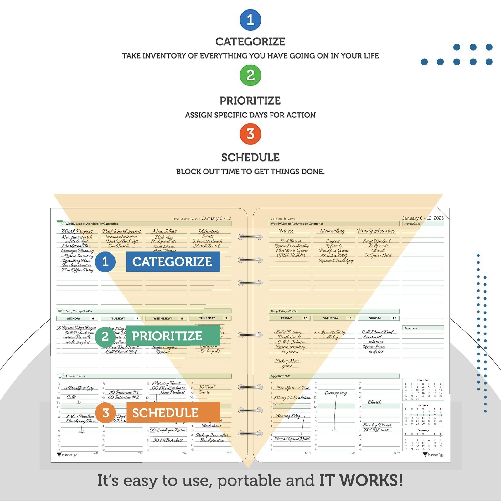 Planner Pad 7 Hole Loose Leaf January-December 2025/ Calendar Year 8 1/2" x 11" Large 3-Tier Funnel Down 12 Month Organizer, Soft Green Ink Product Details Size: January 2025 Start Style: Soft Green Ink Brand: Planner Pad MPN: Excd25L GN UPC: 850051065387 EAN: 0850051065387 Brand: Planner Pad Color: Soft Green Ink Cover Material: Paper Format: Organizer Calendar Type: Gregorian Target Audience: Adult Sheet Size: Letter Material: Paper Item Weight: 0.01 Kilograms Binding: Loose Leaf Manufacturer: Planner Pad Brand: Planner Pad Item Weight: 0.317 ounces Product Dimensions: 8.5 x 11 x 0.5 inches Item model number: Excd25L GN Color: Soft Green Ink Cover Material: Paper Material Type: Paper Size: January 2025 Start Sheet Size: Letter Manufacturer Part Number: Excd25L GN Date First Available: May 14, 2024 SINCE 1974 EXCLUSIVE 3-TIER FUNNEL DOWN approach helps you prioritize and organize all that matters. Section 1- CATEGORIZE is to inventory everything you have going on. Section 2 - PRIORITIZE items from section 1 to specific days for attention. Section 3 - SCHEDULE is to block out time for tasks from section 2 THE 7 DAY WEEKLY VIEW with the Planner Pad organizer allows you to see the big picture of all that you are facing each week. Each day the funneling system channels your attention to the tasks that must be done. You will be more focused and organized in 30 DAYS GUARANTEED or Money Back THE PREMUIM WHITE PAPER STOCK provides superior ink bleed protection. The 7 Hole Loose leaf configuration provides flexibility to add pages and accessories to the planner. Also available in personal size (6 34 x 8 12). Shop by clicking PLANNER PAD STORE below the product description headline THE 12 MONTH Planner Pad planning system starts January 1 and continues thru Dec 31, 2025. Also includes 3 years of planning calendars - each a 2 page spread ideal for blocking out future events. By the first month's end, we GUARANTEE YOUR LIFE WILL BE MORE FOCUSED AND ORGANIZED REFILL 7 HOLE LOOSE LEAF PAGES ONLY COVER REQUIRED/ NOT INCLUDED. We offer a wide range of stylish 7 ring loose leaf covers available in many colors including black, grey, tropical blue and red all crafted to perfectly to fit our loose leaf planning pages. Shop by clicking PLANNER PAD STORE below the product description headline