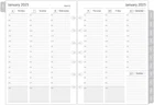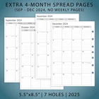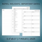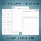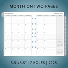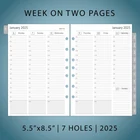 2025 weekly & monthly appointment book pages for 3 ring and 7 ring mini binders 2-page monthly spread with ruled daily blocks, calendar & notes section, laminated month tabs allow quick turning Weekly spread includes 53 weekly pages that have vertical half-hour appointments 7 am – 8 pm and notes sections, Monday – Friday Addtional Note-taking pages, Yearly Goals, Important Dates, Contact, 2024-2025 Calendar and Holidays Pages, extra Sep 2024 to Dec 2024 monthly spread pages (no weekly pages) for early planning This planner refills sizing 5-1/2"x8-1/2" with 7 holes punched, compatible with AT-A-GLANCE (deak size 4, 7-ring), Franklin Covey (classic, 7-ring), Avery (mini binder, 3-ring), and similar 3-ring or 7-ring mini binders Product Description Refill your 3 ring or 7 ring mini binders (5.5"x8.5") and keep organized with this 2025 weekly planner refills that feature coated monthly tabs, daily 7am-8pm schedule weekly pages, yearly goals, important dates, contact and holidays pages. 2025 Weekly Planner Refills Compatible with below brands and similar 3-ring or 7-ring mini binders: AT-A-GLANCE, desk size Avery, mini binder Franklin Covey, classic PLANNING PAGES OVERVIEW
