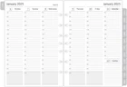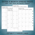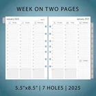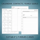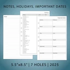 Full year dated planner refills with12 months of weekly and monthly pages, feature coated monthly tabs, daily 7am-8pm schedule weekly pages, yearly goals, important dates, contact and holidays pages. 2025 weekly & monthly appointment book pages for 3 ring and 7 ring mini binders 2-page monthly spread with ruled daily blocks, calendar & notes section, laminated month tabs allow quick turning Weekly spread includes 53 weekly pages that have vertical half-hour appointments 7 am – 8 pm and notes sections, Monday – Friday Addtional Note-taking pages, Yearly Goals, Important Dates, Contact, 2024-2025 Calendar and Holidays Pages, extra Sep 2024 to Dec 2024 monthly spread pages (no weekly pages) for early planning This planner refills sizing 5-1/2"x8-1/2" with 7 holes punched, compatible with AT-A-GLANCE (deak size 4, 7-ring), Franklin Covey (classic, 7-ring), Avery (mini binder, 3-ring), and similar 3-ring or 7-ring mini binders