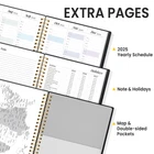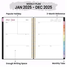 Elevate your organization and productivity with the 2025 Weekly and Monthly Planner. This spiral-bound planner is designed to meet all your planning needs for 2025 and beyond. Whether you're a student, professional, or simply someone who values staying organized, this planner has you covered. Plan your days, weeks, and months with ease using the 2025 Weekly and Monthly Planner. It features dedicated sections for daily, weekly, and monthly planning, ensuring you can manage your time effectively. The 6.4*8.3-inch and 8.5 x 11-inch two size provides ample space for jotting down your appointments, to-do lists, and important dates. The stylish design of the planner adds a touch of elegance to your daily routine, making planning a pleasure. Crafted with high-quality materials, it offers smooth, bleed-resistant pages, so your writing stays clear and legible. The 2025 Weekly and Monthly Planner is more than just a planner; it's a tool to help you achieve your goals and dreams in the year ahead. Stay organized, reduce stress, and make every day count. Don't miss the chance to enhance your productivity and style – order your 2025 Planner now. It's time to take control of your schedule and start the year on the right note. Make 2025 your most organized and successful year yet. PLANNER 2025 - From January 2025 to December 2025 with 12 months of monthly and weekly pages for easy year-round planning; 2025 weekly and monthly planner includes THREE additional monthly pages (October 2024 - December 2024); spiral bound 6.4" x 8.5" Planner is easy to use and carry away. MONTHLY OVERVIEW – 2025 monthly planner includes previous and next month reference calendars for a simple past reviewing and future planning; Notes section for important projects; Major holidays listed, elapsed and remaining days; Durable coated tabbed dividers that are tough and long-lasting, making it easy to find information. Gentle color background hues on the page make instant clarity! WEEKLY OVERVIEW - Two Page spread for each week, from Monday to Sunday offers generous blank writing space; 2025 daily weekly planner includes popular holidays and 3-month reference previews; allowing you to keep track of your appointments, reminders, ideas and to-do lists every day of the week. Vibrant fonts add a visually appealing touch! PREMIUM PAPER - 100GSM Paper Guaranteed Thicker Than Normal! Keeps your planner neat and attractive in your 6.4" x 8.5" sizes 2025 planner book; Water-resistant plastic cover and practical back pocket for added convenience; Sturdy 2025 agenda planner book withstands frequent transfers, ensuring long-lasting reliability and durability to the entire year. Value for money! MORE FEATURES - 2025 daily weekly and monthly planner includes Quick Reference | 25-26 Yearly Overview | Contacts | Special Dates | 25-26 Yearly Schedule | Monthly Section | Weekly Section | Note Pages | Holidays | Map | Double-sided Pockets. Keep you organize throughout the year and easy to use!