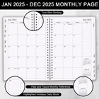 This compact 2025 weekly & monthly planner(January 2025 - December 2025) measuring 6.25" x 8.25", is a simple and elegant planner which could keep you organized everywhere you go. Simple page designs and plenty of room for all of your important information. 12 Month planner contains: yearly overview (calendar of 2025-2026) holidays 2 contact pages 12 month calendar sections 60 week sections 14 notes pages(lined) Each monthly spread contains an overview of the month and a notes section. 12 month calendar, 2 pages per month. Plenty of room for notes and details. Each monthly calendar is followed by 5 weekly pages, 2 pages per week. Weekly spread include ample space to write down your daily schedule, appointments, activities, week's focus, to do list/goal and keep track of all days clearly with the weekly view. This distinctive monthly & weekly planner features high quality 100gsm white paper for easy writing and reducing ink leakage, erase fraying and shade issues, providing clean writing space for your appointments, to-dos and reminders. This monthly and weekly planner responds well to fountain pen, gel pen, roller pen, ballpoint pen, highlighter, pencil and etc. Monthly calendar tabs allow easy access to each month’s plans. Planner 2025 with sturdy and flexible covers to protect the inner pages well, thick paper for smooth writing, strong twin-wire binding, sturdy plastic pocket to store loose items, like tickets, cards, papers etc, all these details demonstrate high quality. This personal organizer 2025 features flexible structures that allow you to keep track of goals, tasks, appointments, project, works, habbits etc. Perfect for planner, organizer, academic agenda or note pad for school, work or home or makes a great gift. Plan, create and schedule your daily life with this gorgeous monthly & weekly planner now. PLANNER OVERVIEW - 12 Month planner 2025, January 2025 - December 2025, featuring 12 months of monthly and weekly pages for easy planning. 6.25" x 8.25", comfortable to carry and use, 3 additional monthly pages (October 2024, November 2024, December 2024) are included MONTHLY - 2025 planner with each monthly spread contains an overview of the month with holidays, previous & next month calendars and a notes section. Plenty of room for notes and details WEEKLY - 2025 planner with weekly spread include ample space to write down your daily schedule, detailed appointments and activities and keep track of all days clearly with the weekly view TABS & POCKET & LAY FLAT BINDING - 2025 planner with each month is separated with laminated tabs, Inner pocket to store loose items like tickets, cards, papers etc. Durable twin-wire binding for laying completely flat SUPERIOR QUALITY - Monthly planner 2025 with sturdy and flexible cover to protect the inner pages well. Thick paper to reduce ink leakage, erase fraying and shade issues. Plan, create and schedule your daily life with this gorgeous monthly &weely planner