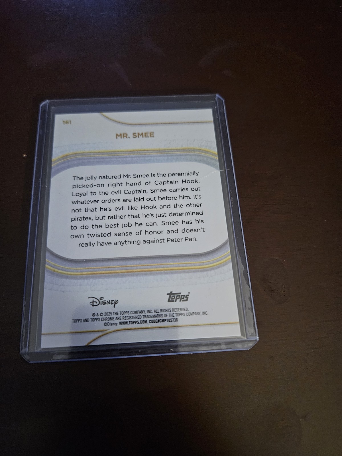 The 2025 Topps Chrome Disney Sapphire Mr. Smee Black Refractor is a highly sought-after trading card featuring the character Mr. Smee from the Peter Pan movies. This limited edition card has a print run of only 10, making it a rare and valuable collectible for fans of the franchise. Produced by Topps, this non-sport trading card is part of the Chrome Disney Sapphire set, showcasing unique black parallel variety that adds to its appeal. With no autograph but authenticated by Topps, this card is a must-have for any collector looking to add a piece of Disney magic to their collection.