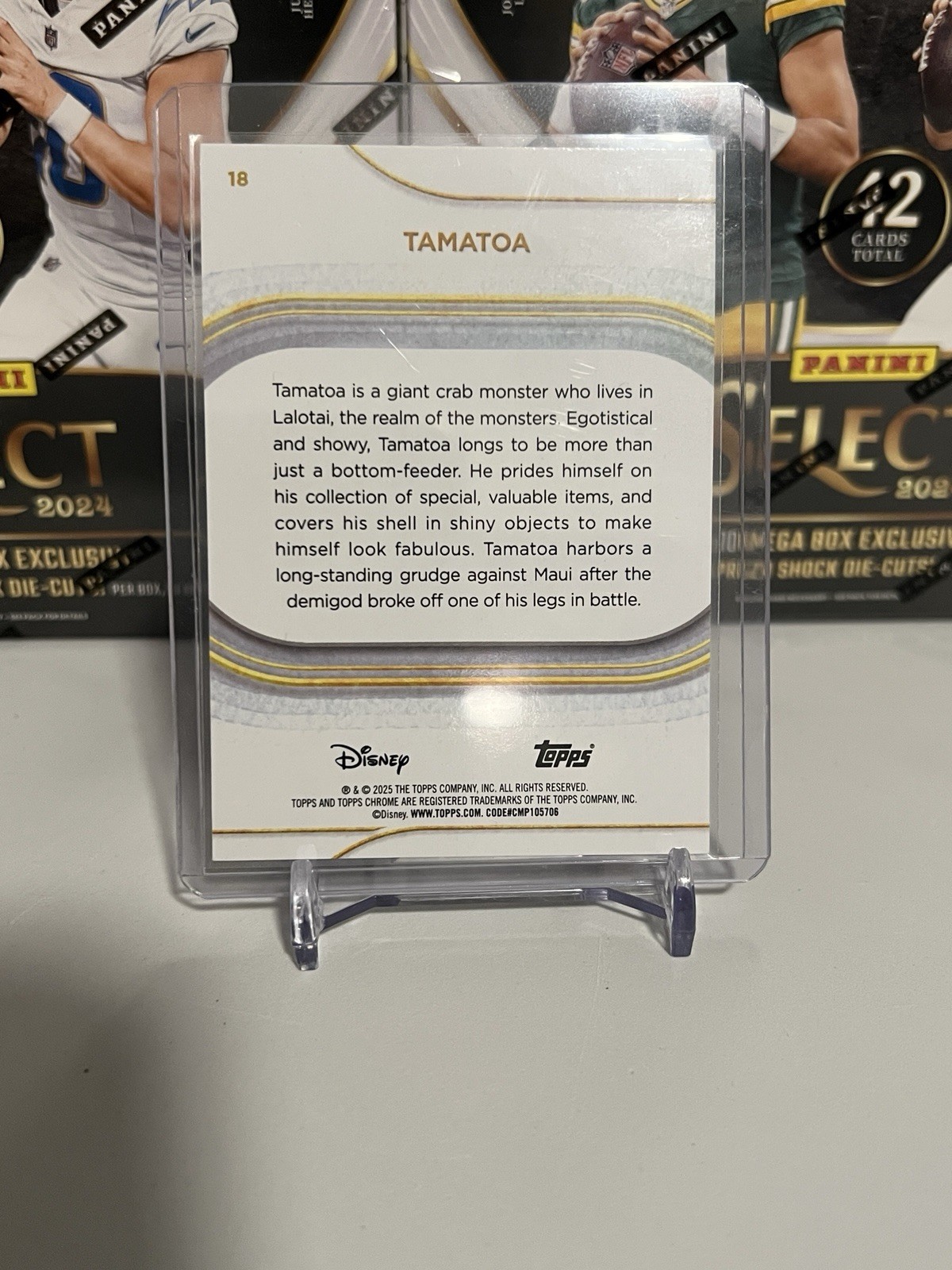 The 2025 Topps Chrome Disney Tamatoa Yellow Mini Diamond Refractor is a highly sought-after trading card featuring the beloved Disney character Tamatoa in a vibrant yellow color with a mini diamond refractor design. As a non-sport trading card from the Disney franchise, this limited edition collectible is sure to be a prized possession for any fan or collector. With its unique design and rarity, this card is a valuable addition to any trading card collection.