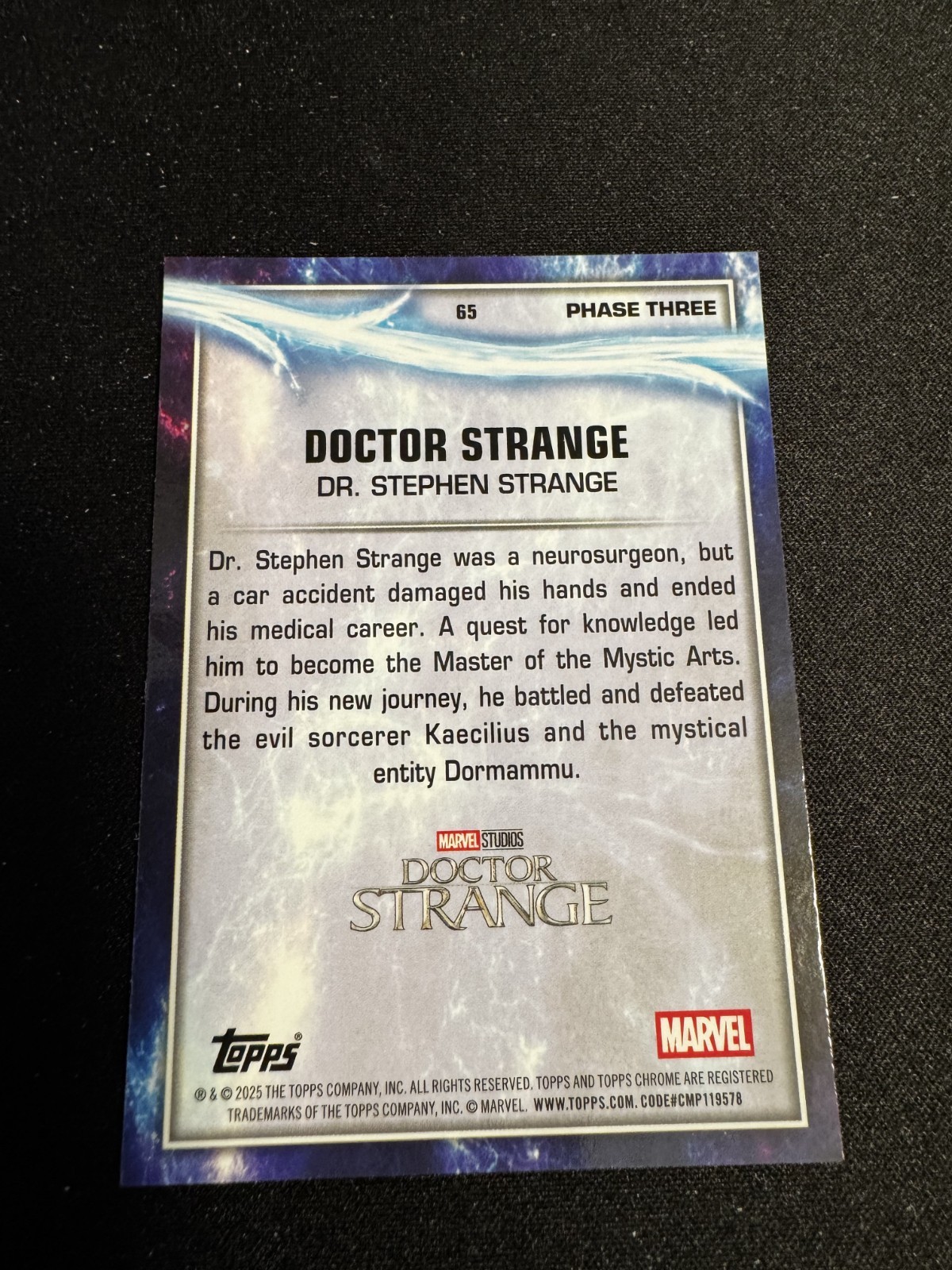 The 2025 Topps Chrome Marvel Studio Dr Strange #65 trading card is a standard-sized collectible featuring the character Dr Strange from the Marvel Studio franchise. Made of card stock with a thickness of 35 Pt., this original non-sport trading card is part of an insert set dedicated to the Marvel Cinematic Universe. Produced by Topps, this card includes features like parallels, varieties, and is a chase card, perfect for fans of superhero, action, and comic genres. With English language text and belonging to the MCU theme, this card is a sought-after addition to any trading card collection.