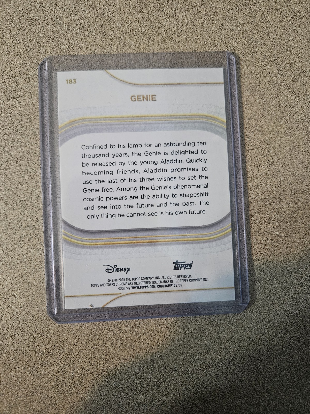 The product is a 2025 Topps Chrome Sapphire Disney Genie Gold trading card, limited to only 50 copies and numbered #183. It features a cut autograph from The Genie, a beloved character from the Disney movie Aladdin. The card is made of card stock with a thickness of 35 Pt. and is an original licensed reprint by Topps, known for its high-quality trading cards. The card is part of the Chrome Sapphire set and has a stunning illustration by Aaron Miller, making it a valuable addition to any Disney or trading card collection.