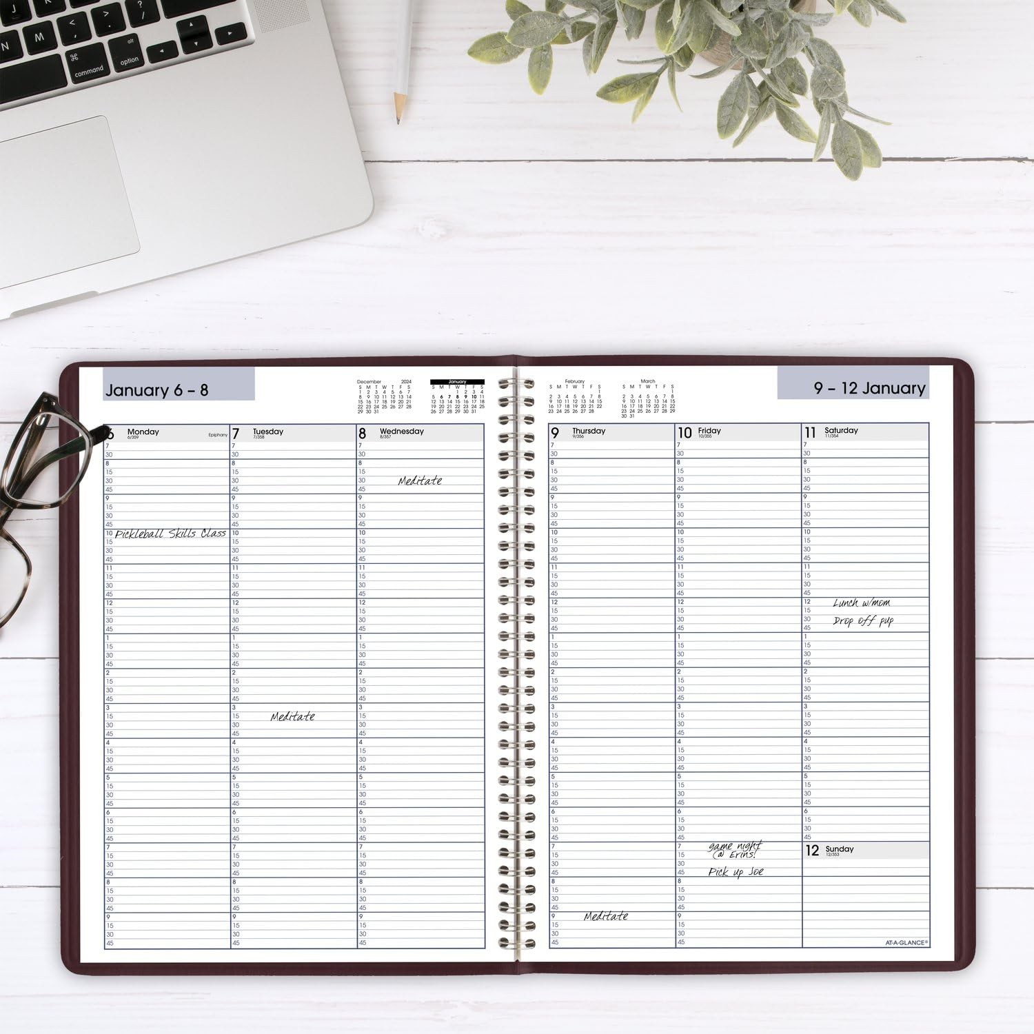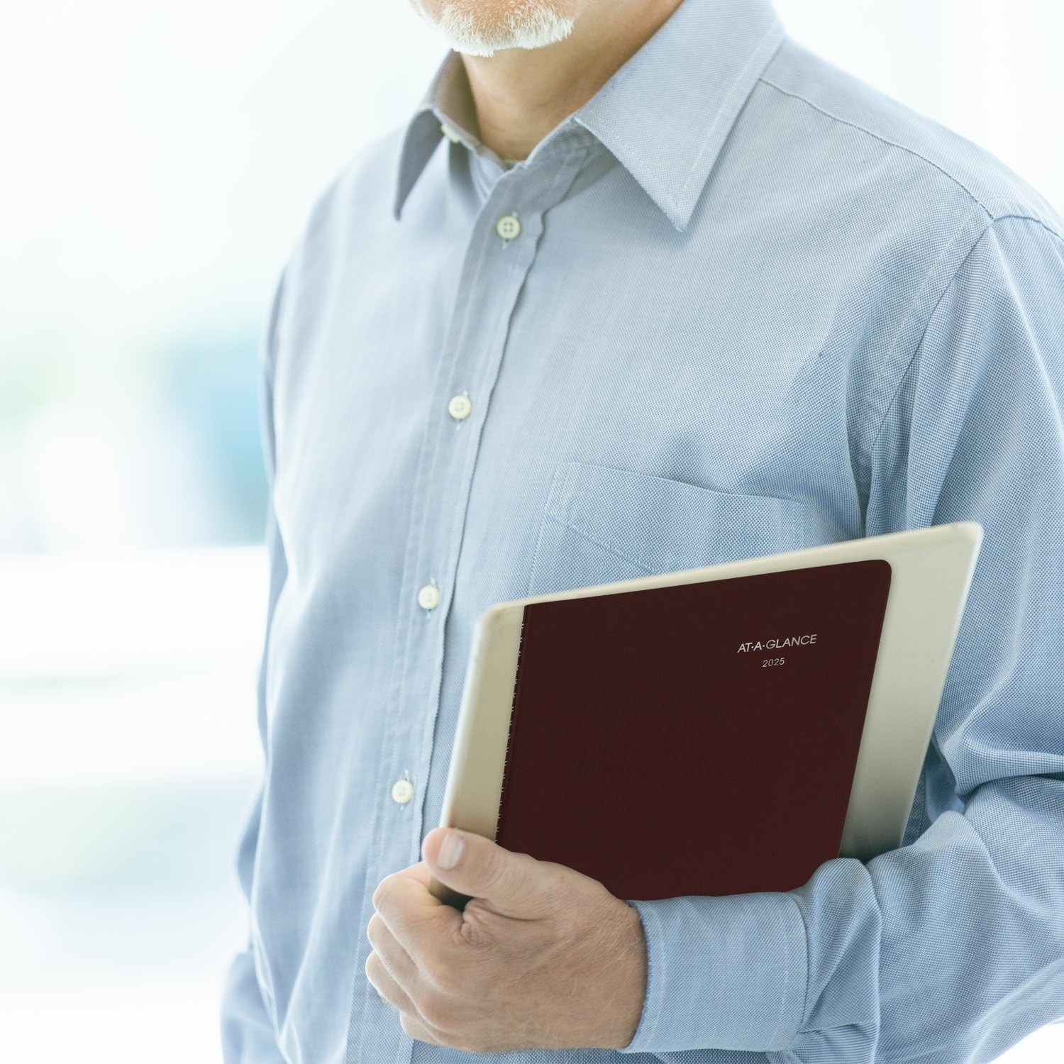 YEAR ROUND PLANNING – Planner covers a 12-month date range from January 2025 — December 2025 with Julian dates GUARANTEED TO LAST ALL YEAR – ACCO Brands will replace any defective planner that is returned within one year from the date of purchase. This guarantee does not cover damage due to misuse or abuse. INK BLEED RESISTANCE – Plan your schedule without fear of distracting ink bleeding. Our high-quality paper is designed for ink bleed resistance, which keeps plans neat and legible. WEEKLY VIEWS – One week per two page spread features ruled hourly appointment times from 7:00 a.m. — 9:45 p.m., Monday — Friday and 7:00 a.m. — 6:35 p.m. on Saturday. Sundays are untimed. Pages measure 8" x 11". SPECIAL FEATURES – Includes a 3-year reference calendar, personal information and important dates PROFESSIONAL DESIGN – Planner has a durable burgundy cover and twin wire binding to help prevent snags and secure pages ASSEMBLED IN THE U.S. – Thoughtfully designed and assembled in the U.S. using high-quality materials
