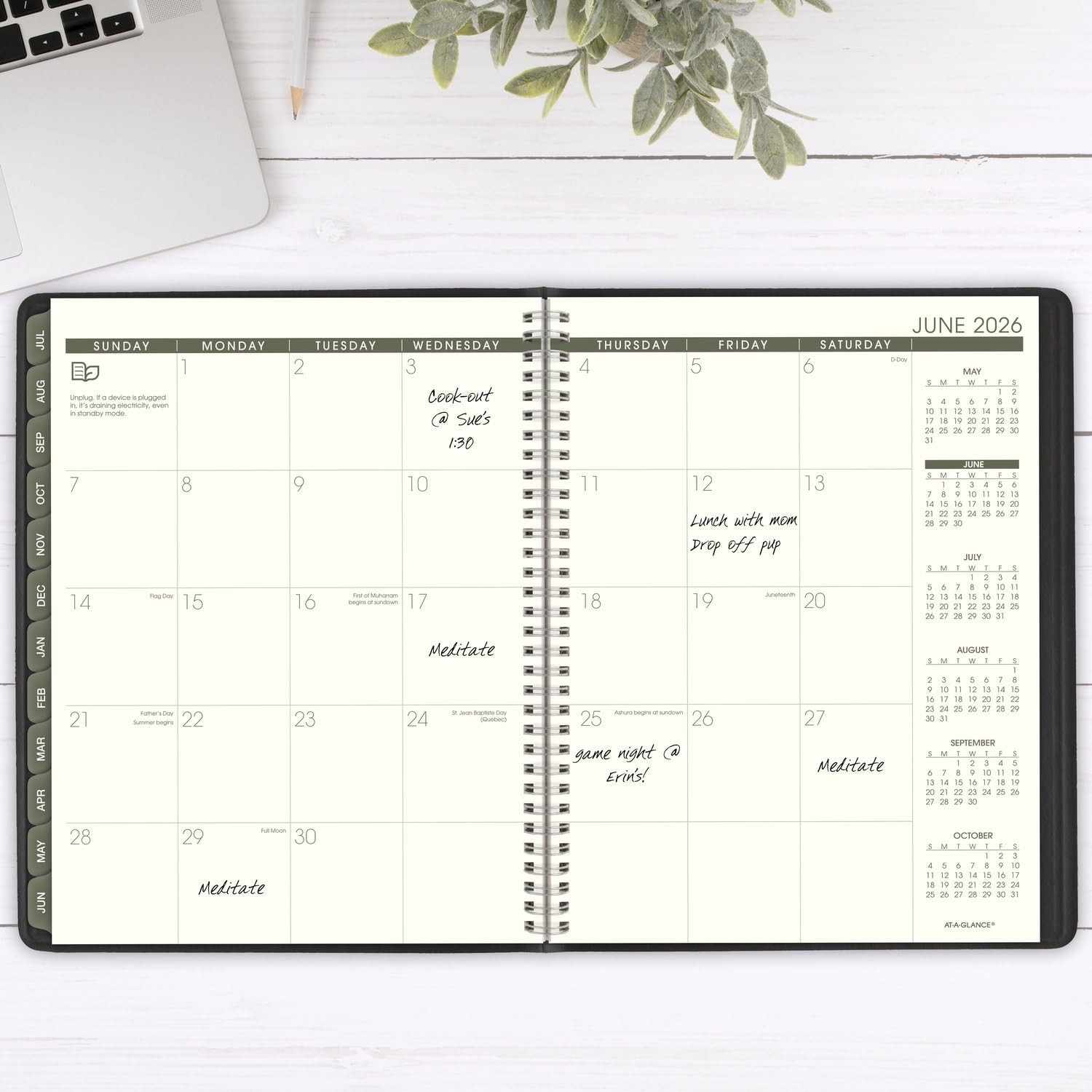 ACADEMIC PLANNING – Keep track of your schedule with an eco-friendly twist this year. Date range covers 12 months from July 2025 – June 2026 with Julian dates. GUARANTEED TO LAST ALL YEAR – ACCO Brands will replace any defective planner that is returned within one year from the date of purchase. This does not cover damage due to misuse or abuse. RECYCLED MATERIALS – Make an environmentally conscious choice. Contains 100% post-consumer waste recycled paper, 50% post-consumer waste recycled covers. Tips for green living included on every page. WEEKLY & MONTHLY OVERVIEWS – Weekly spreads have ruled quarter-hourly appointments weekdays 7:00 a.m. - 8:45 p.m. and Saturdays 7:00 a.m. - 5:30 p.m. Monthly spreads are unruled for open planning. 8-1/4" x 11" page size. ENHANCED ORGANIZATION – Special features include a 3-year reference calendar, 4 future planning pages, important dates, contacts pages and 16 notes pages PROFESSIONAL DESIGN – Planner has a black faux leather cover and twin wire binding to help prevent snags and secure pages