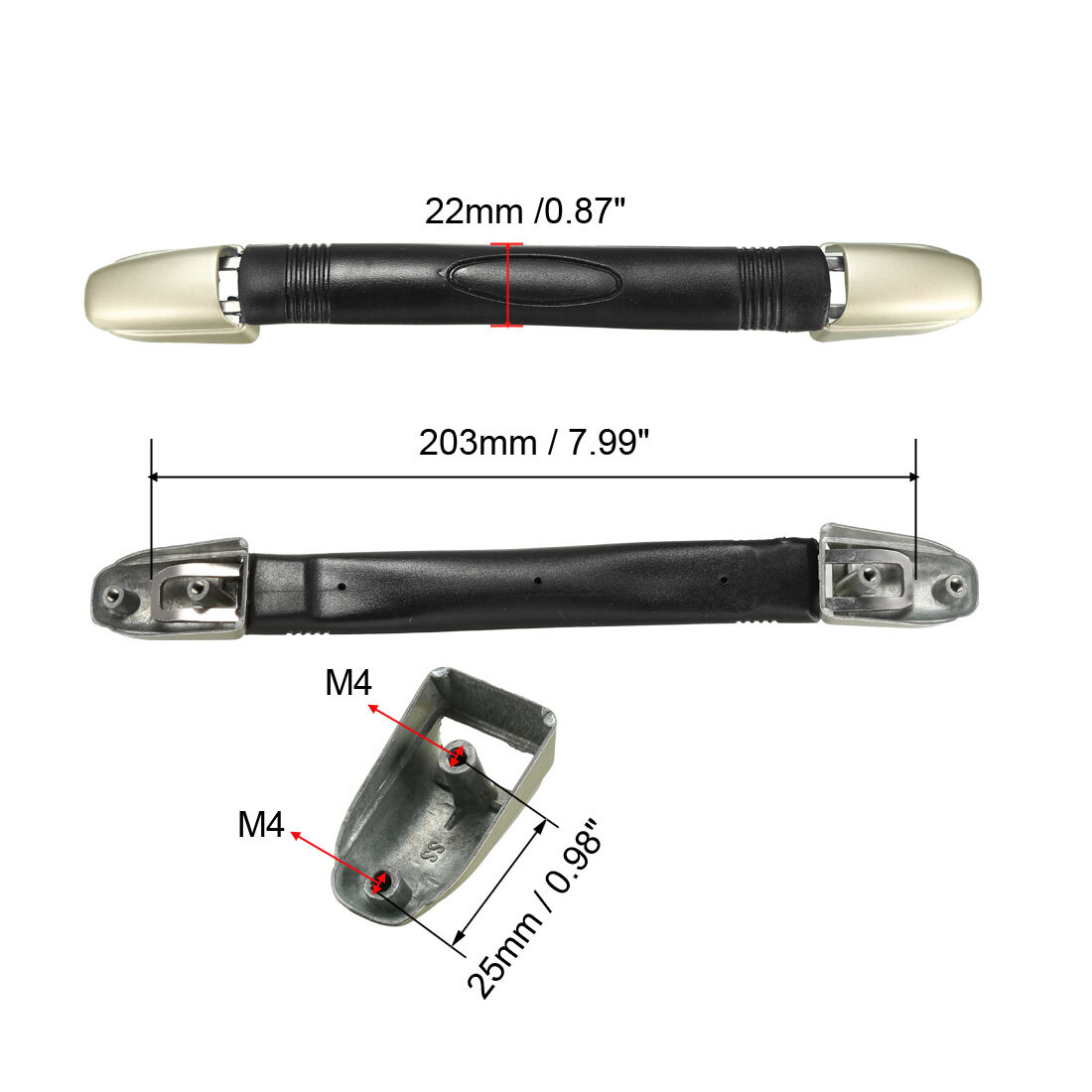 Document Specifications:Material: Plastic, Zinc AlloyMounting Hole Diameter: M4End Cap Hole Distance: 25mm / 0.98-inchEnd Cap Size: 46 x 25 x 18mm / 1.81-inch x 0.98-inch x 0.71-inch(L*W*H)Total Size(Except End Cap): 203 x 22 x 15mm / 7.99-inch x 0.87-inch x 0.59-inch (L*W*H)Total Length(With End Cap): 230mm / 9.06" Package Contents:1 x Suitcase Handle2 x Metal End caps Descriptions:1.Plastic main structure, Zinc Alloy end caps, comfortable rubber grip.2.Widely used for box, case, luggage, suitcase.3.good replacement for your old broken ones.4.Easy to install, you can attach them with screws.(Mounting screws are NOT included here)5.This pull handle adopts the good manufacturing process of engineering plastic and soft rubber secondary injection molding, which makes it more comfortable and durable. Luggage Handle, 203mm Long Strap Grip Replacements for Suitcase Case Black Specifications: Material: Plastic, Zinc Alloy Mounting Hole Diameter: M4 End Cap Hole Distance: 25mm / 0.98-inch End Cap Size: 46 x 25 x 18mm / 1.81-inch x 0.98-inch x 0.71-inch(L*W*H) Total Size(Except End Cap): 203 x 22 x 15mm / 7.99-inch x 0.87-inch x 0.59-inch (L*W*H) Total Length(With End Cap): 230mm / 9.06" Package Contents: 1 x Suitcase Handle 2 x Metal End caps Descriptions: 1.Plastic main structure, Zinc Alloy end caps, comfortable rubber grip. 2.Widely used for box, case, luggage, suitcase. 3.good replacement for your old broken ones. 4.Easy to install, you can attach them with screws.(Mounting screws are NOT included here) 5.This pull handle adopts the good manufacturing process of engineering plastic and soft rubber secondary injection molding, which makes it more comfortable and durable. Hot Item Payment 1.We accept eBay payment . 2.Payment must be received within 7 business days of auction closing. Shipping 1.We ship to your eBay or Paypal address. Please make sure your eBay and Paypal address is correct before you pay. 2.Items will be shipped within 1-3 business day when we received payment. 3.Delivery time depends on destination and other factors. Description Policy Luggage Handle, 203mm Long Strap Grip Replacements for Suitcase Case Black Specifications: Material: Plastic, Zinc Alloy Mounting Hole Diameter: M4 End Cap Hole Distance: 25mm / 0.98-inch End Cap Size: 46 x 25 x 18mm / 1.81-inch x 0.98-inch x 0.71-inch(L*W*H) Total Size(Except End Cap): 203 x 22 x 15mm / 7.99-inch x 0.87-inch x 0.59-inch (L*W*H) Total Length(With End Cap): 230mm / 9.06" Package Contents: 1 x Suitcase Handle 2 x Metal End caps Descriptions: 1.Plastic main structure, Zinc Alloy end caps, comfortable rubber grip. 2.Widely used for box, case, luggage, suitcase. 3.good replacement for your old broken ones. 4.Easy to install, you can attach them with screws.(Mounting screws are NOT included here) 5.This pull handle adopts the good manufacturing process of engineering plastic and soft rubber secondary injection molding, which makes it more comfortable and durable. Hot Item Payment 1.We accept eBay payment . 2.Payment must be received within 7 business days of auction closing. Shipping 1.We ship to your eBay or Paypal address. Please make sure your eBay and Paypal address is correct before you pay. 2.Items will be shipped within 1-3 business day when we received payment. 3.Delivery time depends on destination and other factors.