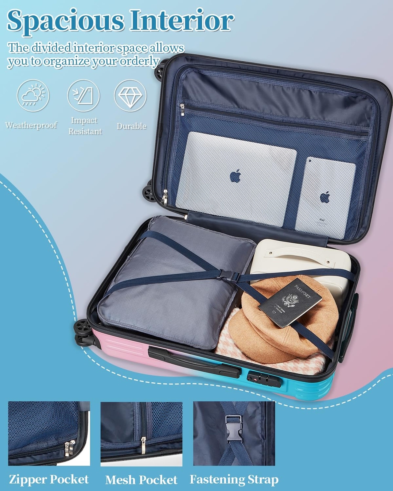 Carry On Suitcase, 20 Inch Carry On Luggage with Wheels, Hardside Large Suitcases with Wheels, TSA Lock Product Details Color: Sweet Size: S(Carry-on-20") Brand: sukiost MPN: LXL004 UPC: Does not apply EAN: Does not apply Product Dimensions: 14.2 x 9.8 x 22.8 inches Item Weight: 6.6 pounds Department: Unisex Adult Manufacturer: sukiost Country of Origin: China Item model number: LXL004 Item Weight: 3 Kilograms EXTRA EXPANDABLE SPACESuitcase can be extended by zipper for extra space, which can increase the capacity by 20%, our luggage providing extra space for storing souvenirs and leaving you with no regrets on your trip. 360 DOUBLE SPINNER WHEELSLuggage is equipped with double spinner wheels, which are very easy to maneuver and allow for 360 freedom of movement, allowing you to glide effortlessly through your travels. TELESCOPING HANDLELuggage is designed with a push-button locking handle that extends to 3 different heights, no matter whether you're short or tall, dragging or standing. Stores neatly in luggage when not in use. TSA COMBINATION LOCKSuitcase have built-in TSA lock allows only TSA agents to inspect your luggage without damaging the lock as well as provides greater protection for your belongings. RELIABLE WARRANTYWe provide a two-year warranty, you can always contact our after-sales team, we will actively solve the problem for you to your satisfaction.