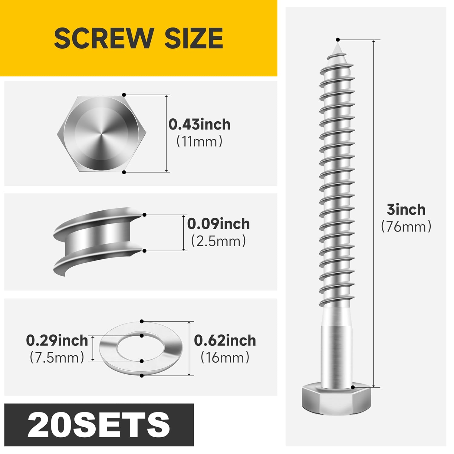 【PRODUCT NAME】 20 sets lag bolts for wood, with 1/4 bolt and 1/4 stainless washer stainless steel bolts, various sizes and precise threads for different usage. Stainless steel hex head screws. Package includes: 20 pcs 1/4"x3" bolts + 20 pcs flat washers. 【MATERIAL】 High quality 304 stainless steel screws and bolts. Mywish lag screws have been rigorously tested, higher heat resistance, corrosion resistance and anti-rust effect in different extreme environment. Strong solid structure and longer lifespan. Please note that the magnetic properties of 304 steel always show weak magnetic properties due to the structure transformation reasons. 【WIDE RANGE OF APPLICATIONS】 40 pieces cost effective bolt kit. Stainless hexagonal head screw are suitable for furniture assembly (beds, tables, cabinets, chairs, etc.), woodworking projects (joining wood, boards, workbench, kitchen worktops). Lag bolts are used as furniture bolts in timber framing, deck construction, and mounting outdoor fixtures. 【PACKAGING】 40 Pieces 1/4 stainless steel bolts kit, comes with sturdy and reusable transparent storage container. Label with the size and quantity of hex bolts. Easy to distinguish the size of 1/4 bolt. Provide variable solutions to meet diverse situation. All within a comprehensive kit. 【AFTER SALE SERVICE】 MYWISH team aims to provide our customers with a professional service. Dedicated to promptly solving any concerns or queries. Please contact us if you have any issues with the products. 【Small Tip】 The screw set includes small-sized components, ensuring safety precautions to prevent access by any children under 6 years old. Mywish prioritize safety measures, please keep these items out of reach of young children. Product Description MYWISH ONE-SIZE SCREWS PACK Add to Cart Add to Cart Add to Cart Add to Cart Add to Cart Add to Cart Customer Reviews 4.5 out of 5 stars 121 4.6 out of 5 stars 100 4.8 out of 5 stars 18 4.5 out of 5 stars 141 4.6 out of 5 stars 181 4.9 out of 5 stars 41 4.5 out of 5 stars 57 Price $13.99 $ 13 . 99 $9.99 $ 9 . 99 $22.99 $ 22 . 99 $25.99 $ 25 . 99 $29.99 $ 29 . 99 $39.99 $ 39 . 99 $9.99 $ 9 . 99 Material 304 Stainless Steel 304 Stainless Steel Carbon Steel 410 Stainless Steel 410 Stainless Steel Carbon Steel Carbon Steel Head Style Hex Head Hex Head Hex Head Hex Head Truss Head Hex Head Torx/Star Drive Head Drive System External Hex External Hex External Hex External Hex Phillips External Hex Torx Exterior Finish Plain Finish Electrophoresis Black Zinc Plated Plain Finish Black Zinc Plated Black Epoxy Coated Tan Epoxy Coated No Predrilling ✔ ✔ ✔ ✔ ✔ ✔ ✔ Drill Bit Included ✔ ✔ ✔ ✔ ✔ ✔ ✔ The lag bolts are made of high quality 304 stainless steel. Includes 3/8 bolt, 1/4 20 stainless steel bolts, 3/8-16 bolt. As a hex head screws kit, each lag bolt of the set rigorous quality check to ensure precision, reliability & durability. The lag screws are suitable for many projects. The sturdy box for stainless steel bolts effectively shields the 1/4 20 bolt, 5/16 20 bolt, 3/8 bolts and stainless washers from damage during transportation of hex head screws, maintaining the integrity of appearance and structure, ensuring the screws set remains intact for an extended period. Lag screws are used in heavy-duty construction & woodworking projects. Lag Bolts are used as furniture bolts like fastening large wood pieces, heavy objects, hardware to wood, masonry, concrete surfaces, particularly in projects like timber framing, deck construction, and mounting outdoor fixtures.
