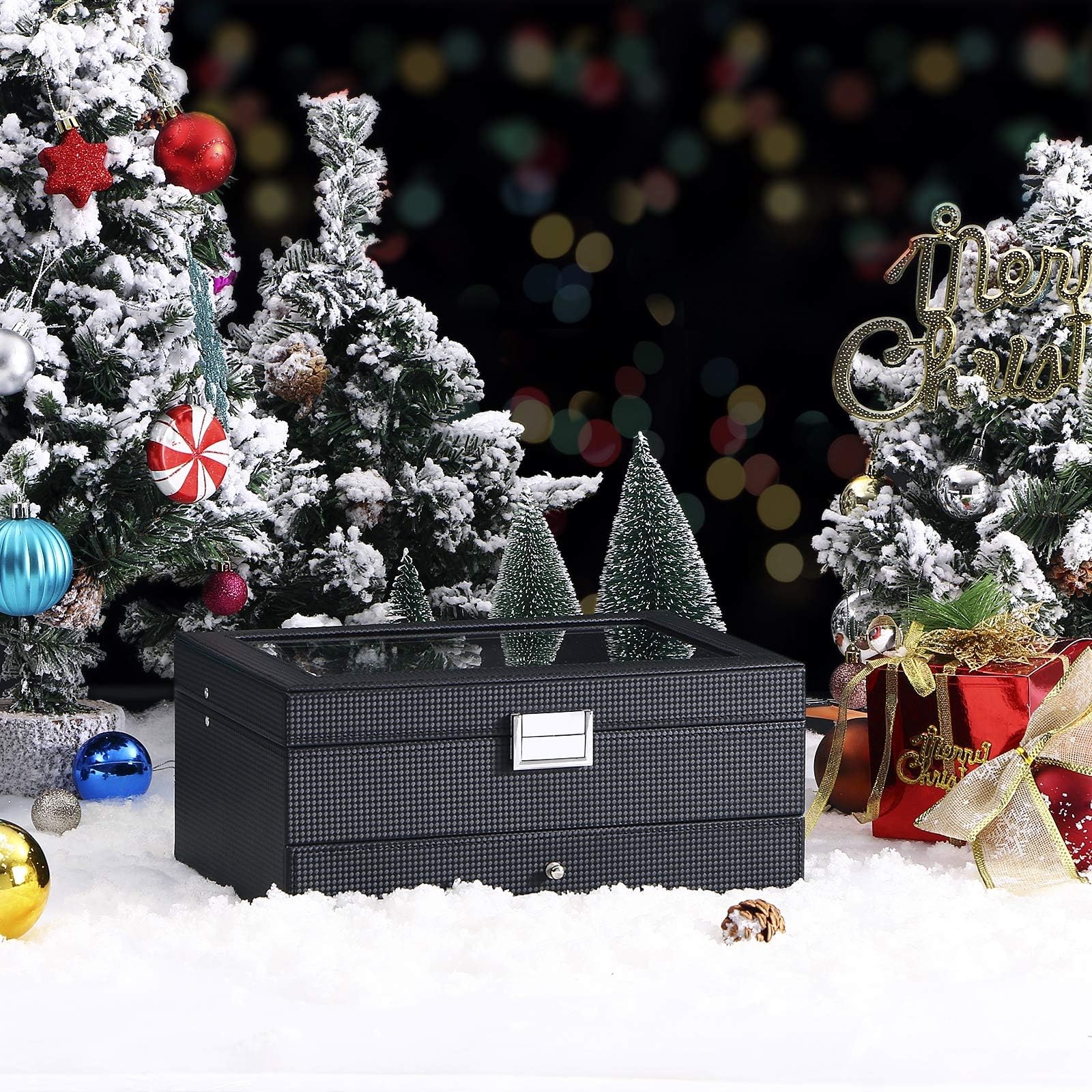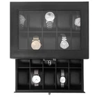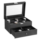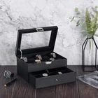 This Double Layers 20 slots watch case allows all the watch enthusiasts to show your watches and keeping them away from dust, fingerprints, scratches and thieves. Beautiful and elegant, it makes your watch easier to find. Makes for the perfect gift for watch collectors! And it is also the best gift for a father, a mother, girlfriend, wife, daughter, colleague, friend or any other special person in your life for valentine's Day, Christmas, New Year, Birthday and so on. Specifications: - Material: Carbon Fiber Faux Leather, Medium Density Fiberboard (MDF) and Faux Leather interior pillows - Window: Real Glass - Color: Black Watch Box, Grey Pillows - Product Dimensions (W x D x H): 11.3" x 8" x 5.9"(28.7 x 20.5 x 15cm) - Glass Window: 8.66" x 6" (22 x 15cm) - Watch Slot Size: 3.5" x 1.8"(8.9 x 4.5cm) - Pillow Size: 3" x 1.9"(7.6 x 4.8cm) - Second Tier Size: 11.2" x 7.68" x 2.67"(28.4 x 19.5 x 6.78cm ) - Net Weight: 4.6 lbs Package Contents: - 1 x Watch Box - 20 x Removable Pillows 100% SATISFACTORY SERVICE & WARRANTY: We promise to offer 100% satisfaction to our customer. If you are not satisfied with your purchase for any reason, please kindly contact us, we will solve the problem till you are satisfied. We will either replace it or refund your money, your choice! HIGH QUALITY PILLOWS & FIT FOR VARIOUS WATCH STYLES AND SIZE: Made of high quality velvet and sponge cushions, indeformable & soft, protect your watches from dust, damp and shock perfectly. The flexible velvet squares are large enough to fit men's giant wrists, but also pliable enough to accommodate women's daintier jewelry if need be. Each watch slot is 3.5"x 1.9" (W x D) STURDY METAL HINGE & ONE HAND EASY OPEN BUCKLE: There is a sturdy metal hinge support instead of cloth ribbon which helps to keep the top propped open. The lid snaps into the latch when closed and to open. You can open and close it with one handed operation, very convenient and no time consuming TOP-NOTCH QUALITY & FANTASTIC LOOK: Made from good quality black PU leather cover, well-done seams, refined interior, smooth actual hinge, see-through real glass top, this well-built watch box is sturdy as well as elegant. Your beloved must be very happy when receiving such a nice gift at birthday or Christmas CONVENIENT LARGE SEE-THROUGH GLASS WINDOW: Do you always tuck your watch collection away in a drawer or just let them sit around on desks everywhere? have you felt frustrated to search all your place to find the watch you want to wear? This watch box, with real glass window, is able for you to see all the watches in the box and help you decide quickly which watch to wear. It will display all your watches in a convenient, fashionable and clear way PRODUCT SIZE & MULTI-FUNCTIONAL COMPARTMENT: Product dimension: 11.3" x 8" x 5.9" (W x D x H). The pillows when removed allow for cufflinks, bracelets, tie tacks, etc. Pull out drawer is a nice bonus, whether you are storing watches or other jewelry