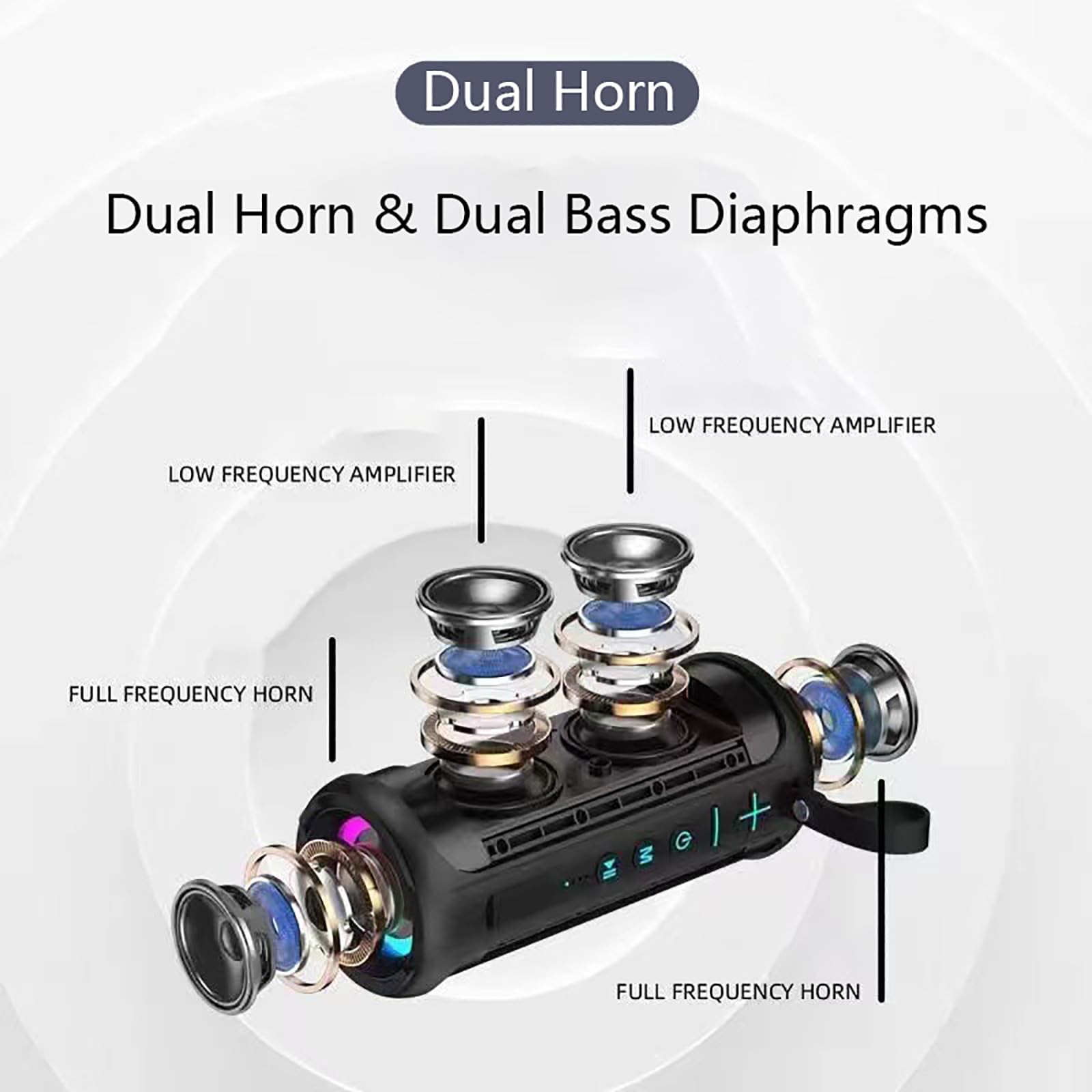 Embark on your outdoor adventures with our versatile 20W waterproof speaker that packs a punch with dual 10W speakers and a bass diaphragm for an immersive audio experience. This powerful blue-tooth speaker is designed for the rigors of outdoor activities, boasting an IPX6 water resistance rating that allows you to enjoy your music rain or shine. Equipped with Bluetooth 5.1 technology, the speaker offers seamless connectivity and a stable audio transmission. Its RGB lighting dynamically changes to enhance the mood, whether you're at a campsite, on a hiking trail, or cruising down the road. The speaker's rechargeable 2400mAh battery ensures long-lasting performance, delivering up to 10 hours of playback on a single charge. Moreover, this speaker supports TWS interconnectivity, allowing you to pair two speakers for a stereo effect. AUX input and TF card playback compatibility add to its versatility, making it the perfect companion for any occasion. Plus, with a built-in microphone, you can even use it for hands-free calls. Take your music with you wherever you go and make every moment memorable. Powerful Audio Performance: Equipped with dual 10W speakers and a bass diaphragm, delivering rich and powerful sound with enhanced bass for an immersive listening experience. IPX6 Water Resistance: Designed to withstand splashes and light rain, ensuring uninterrupted music playback even in wet conditions. Long-Lasting Battery Life: A 2400mAh rechargeable battery powers up to 10 hours of playback, ensuring you can enjoy your music throughout the day. Versatile Connectivity: Supports Bluetooth 5.1 for wireless streaming, AUX input for wired connections, and TF card playback for your personal music collection. RGB Lighting & Additional Features: Dynamic RGB lighting adds a vibrant visual experience, while the built-in microphone enables hands-free calls and the TWS interconnectivity allows for stereo sound. Perfect for outdoor activities, travels, and more.