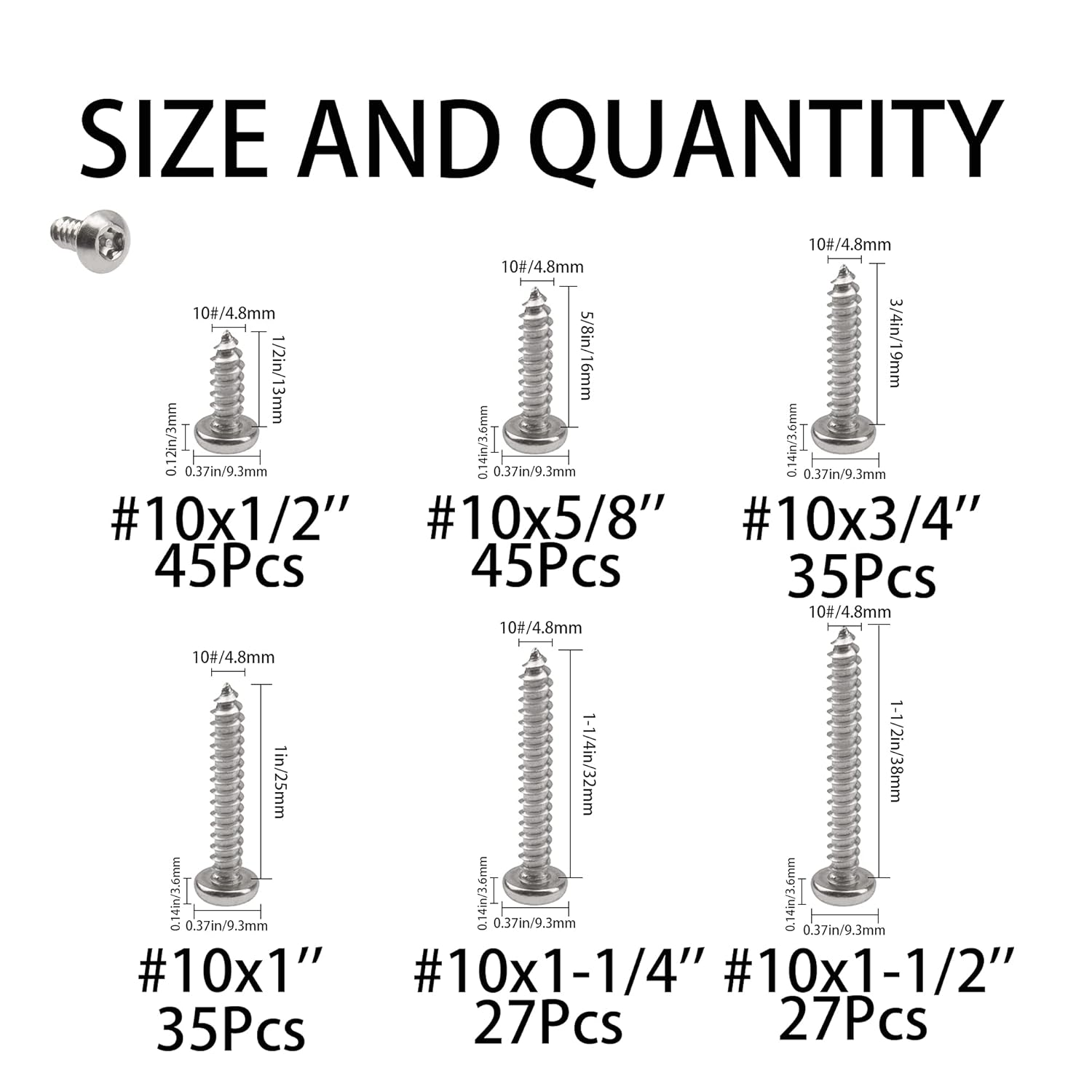 Store New Arrivals Add to Favorite View Feedback Contact 214Pcs 304 Stainless Steel Button Head Torx Security Screws Anti-Theft Tamper Resistant Screw Assortment Set, #10 X 1/2'' / 5/8'' / 3/4'' / 1" / 1-1/4'' / 1-1/2'' with T25 Bit Description Item model number WD055 Material Stainless Steel Drive System Torx Thread Size 0.75 inch Head Style Button Exterior Finish Stainless Steel Package Dimensions 8.5 x 6.65 x 1.73 inches; 1 Pounds MATERIAL: Torx security screws are made with high quality 304 Stainless Steel, not easy to rust, Anti-moisture, Anti-oxiclation, corrosion resistant, acid/alkali resistance for indoor and outdoor use. PACKING QUANTITY: 214Pcs torx security screws 6 Sizes: #10x1/2''--45Pcs, #10x5/8'''--45Pcs, #10x3/4''--35Pcs #10x1"--35Pcs, #10x1-1/4''--27Pcs, #10x1-1/2''--27Pcs, T25 bit(2Pcs) for your installation. SUITABLE FOR: Great for your home, office and industry use, specially used for securing materials from being tampered with, You will often see security screws used in bathroom stalls and other public locations. They are also used in food prep and processing areas. PLASTIC HEAT SEAL PACKAGING: Practical and convenient of packing box, All of torx security screws are packed in a durable and sturdy box, this box can be use for a storage box. DURABLE DIVIDED STORAGE CASE: All torx security screws are packed in the box with size label and divider, easy to store and won't mix up. MATERIAL: Torx security screws are made with high quality 304 Stainless Steel, not easy to rust, Anti-moisture, Anti-oxiclation, corrosion resistant, acid/alkali resistance for indoor and outdoor use. SUITABLE FOR: Great for your home, office and industry use, specially used for securing materials from being tampered with, You will often see security screws used in bathroom stalls and other public locations. They are also used in food prep and processing areas. PLASTIC HEAT SEAL PACKAGING: Practical and convenient of packing box, All of torx security screws are packed in a durable and sturdy box, this box can be use for a storage box. 5.DURABLE DIVIDED STORAGE CASE: All torx security screws are packed in the box with size label and divider, easy to store and won't mix up. WHAT YOU WILL GET: 214Pcs Torx Security Screws 6 Sizes #10x1/2''---------------------------45Pcs, #10x5/8''---------------------------45Pcs, #10x3/4''---------------------------35Pcs #10x1"------------------------------35Pcs, #10x1-1/4''-------------------------27Pcs, #10x1-1/2''-------------------------27Pcs, T25 Bit-------------------------------2Pcs, NOTE: Due to the difference between different monitors, the picture may not reflect the actual color of the item. WARM TIPS: Products contain small parts, please do not let children play, to prevent inadvertent swallowed. CUSTOMERS SERVICE: We will support lifetime garrantee and 100% money back for your problem, in addition, we offer 24H always online service, welcome to come to us if you need help. ABOUT US We offer the best prices around on high quality products. Our E-store includes media such as books, movies, music and games while offering electronics, toys, sporting apparel, clothing, tools, general home, garden items and more. SHIPPING We are always working hard to ensure your package arrives as soon as possible. Please understand that some factors like weather, high postal traffic, and the performance of shipping companies are outside of our control. We offer free shipping to the lower 48 states and ship within 2 business days of payment, usually sooner. We do not accept P.O. Boxes. Please provide a physical address. RETURNS We offer a 30-Day Return Policy on items which you are not completely satisfied with. You have the option for a full-refund or an exchange of the item. No returns are available on items shipped outside of the USA. PAYMENT We accept PayPal. CONTACT US This page content is yet to come Please ad us to your favorite seller and visit again later Thank You CUSTOMER SATISFACTION We try our very best to make sure every customer is completely satisfied. If there's a problem, message us! We're happy to help.