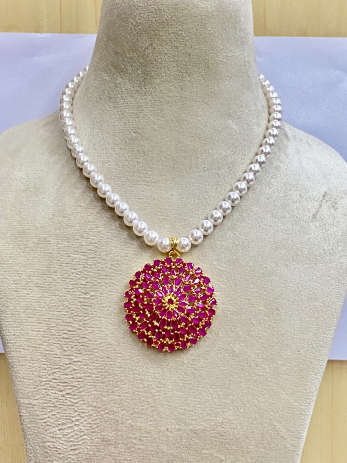 Add a touch of timeless elegance to your jewelry collection with this stunning 22K Yellow Gold Plated Pendant Set, handmade by the artisans of Ray Fine Ornates, Jaipur, India. This pendant set beautifully combines the sparkle of rubies and emeralds with the delicate charm of pearls, showcasing intricate hand-setting craftsmanship. Each piece is designed with love, precision, and traditional Indian artistry, making it a perfect addition for weddings, festive occasions, temple wear, or gifting purposes. The pendant features a classic round design with gemstone embellishments, carefully hand-set to perfection, while the matching earrings complement the set gracefully. The shimmering gold plating over high-quality brass ensures a luxurious finish and long-lasting durability. Celebrate your love for ethnic jewelry with this versatile and charming piece! Product Features: Material: High-quality brass base with 22K Yellow Gold Plating Stones Used: Simulated Ruby, Emerald, and Real Pearl accents Design: Traditional ethnic round pendant with matching earrings Craftsmanship: 100% handmade with hand-set gemstones Pendant Size: Approx. 4 cm Earrings Size: Approx. 2.5 cm Plating: Nickel-free, 22K yellow gold plating for safe and comfortable wear Occasion: Ideal for weddings, festivals, religious events, and gifting Care Instructions: Store in a dry place. Avoid direct contact with water, perfumes, and chemicals for long-lasting shine. Origin: Handmade in Jaipur, India by Ray Fine Ornates 🎁 Perfect Gift For: Brides and Bridesmaids Mother's Day Birthdays and Anniversaries Traditional and Religious Occasions Lovers of Indian ethnic and temple jewelry