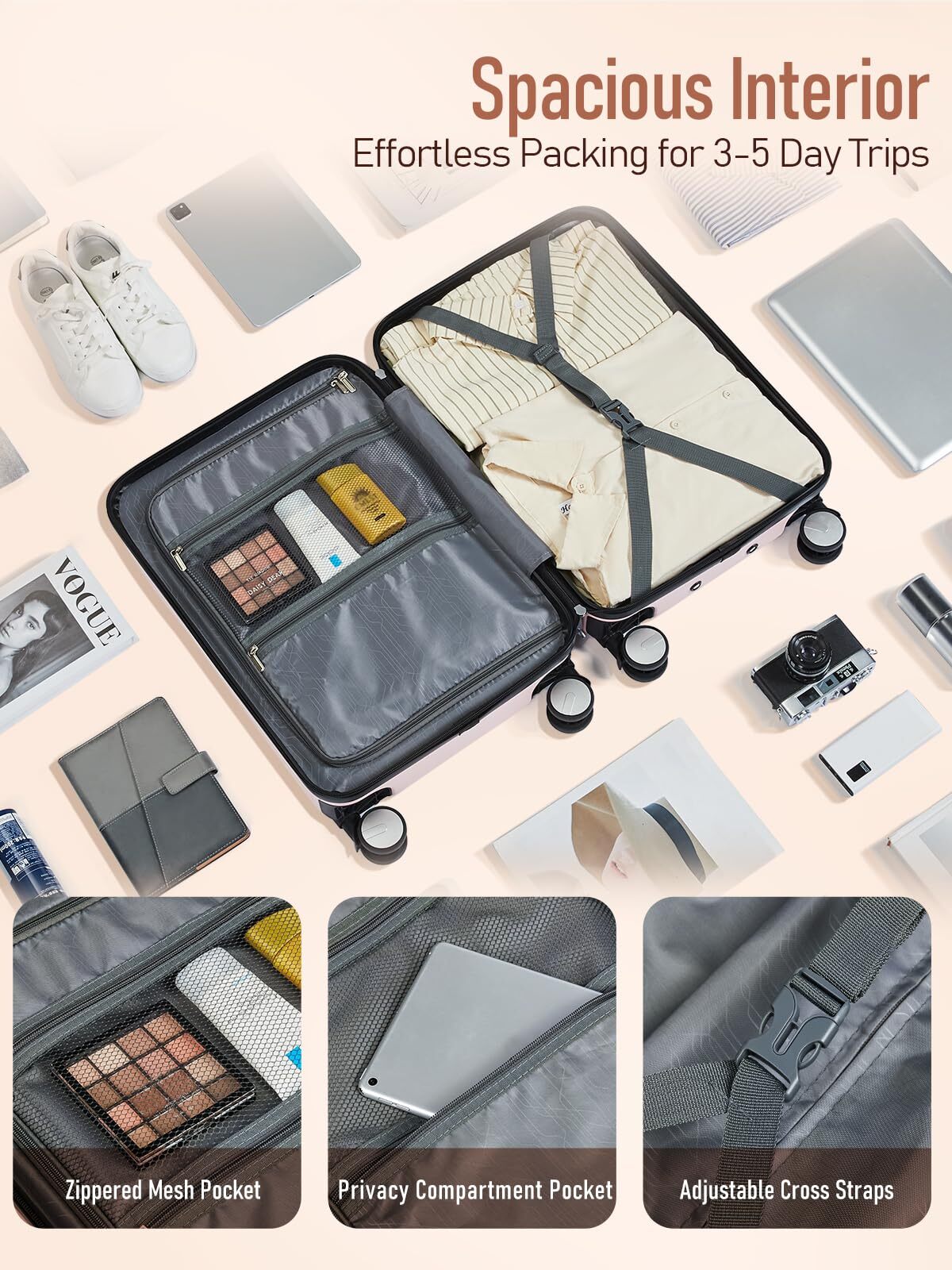 Airline Approved: The carry-on luggage meets the carry-on requirements for most airlines. Overall dimensions: 13.58 x 9.06 x 22.24 inches, volume: 37 liters, weight: only 5.86 lbs. Lightweight & Durable Hardshell: Crafted from premium 100% PC material, travel luggage is extremely lightweight yet impact-resistant to withstand the rigors of travel. Easy To Maneuver: Experience effortless travel with our 20 inch luggage featuring 8 silent spinner wheels. Glide through airports, effortlessly maneuver busy streets, and conquer any terrain with silent, smooth precision. Effortless Organization: The carry on suitcase with two spacious main compartments, mesh zipper pocket, and privacy compartment pocket, keeps accessories and small items neatly organized. Tie-down straps secure belongings, making packing a breeze, ensuring a stress-free trip. TSA-Approved Locks: Durable double-ended zippers and TSA-approved locks provide rugged security, ensuring your luggage passes airline baggage inspection without damage. hardside luggage provides travelers with extra security and peace of mind.(The original password is 0-0-0)
