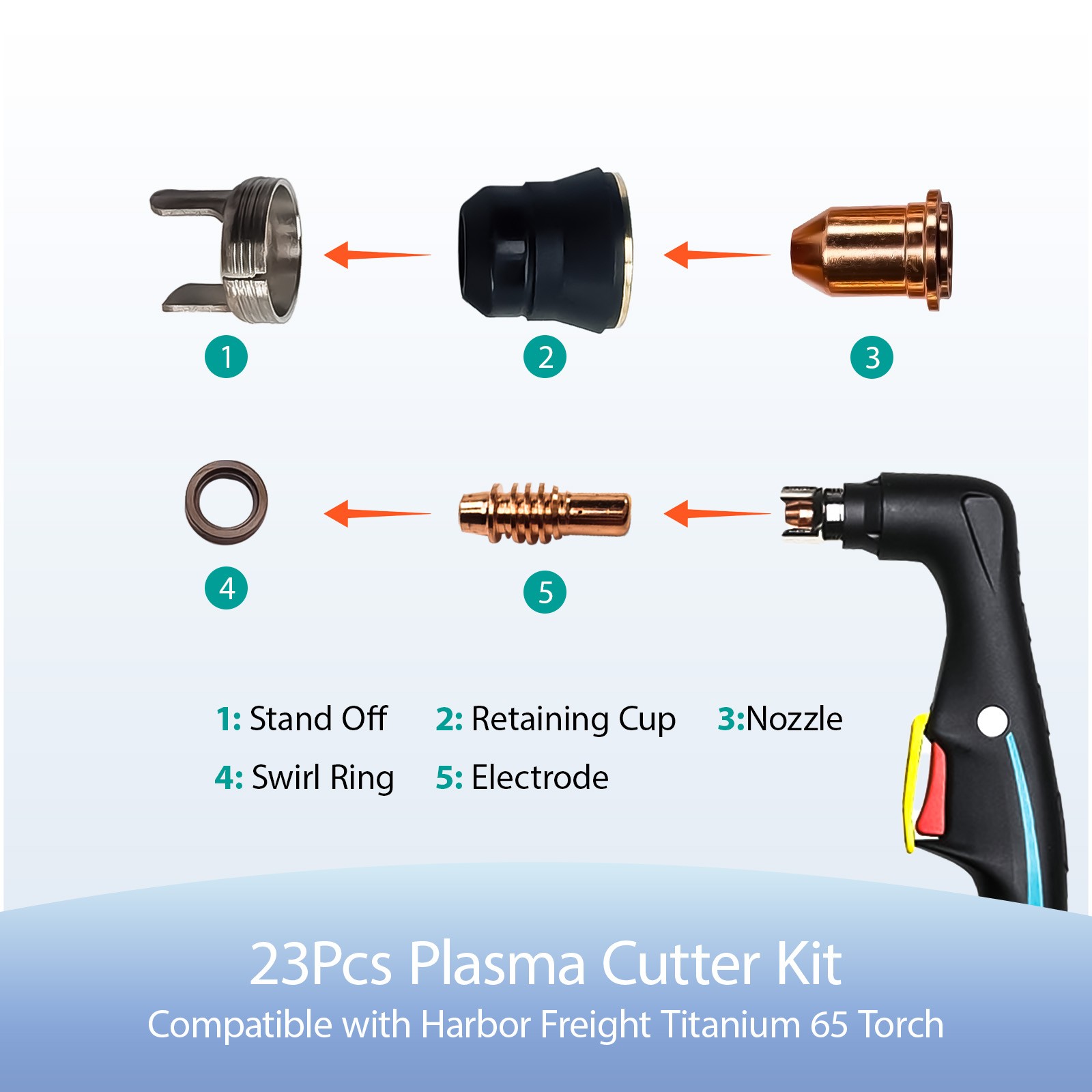 Plasma Cutter Consumable Fit For Harbor Freight Titanium Plasma65 TI-PC65 iPT-65 Product description Package list : Plasma torch TI-PC65 tips kit Replacement mod : Plasma65 TI-PC65 iPT-65 56255 56811 59182 58895 59164 Plasma cutter consumables compatible with : fits Harbor Freight Titanium Plasma65 TI-PC65 iPT-65 Plasma Cutter Torch Consumables