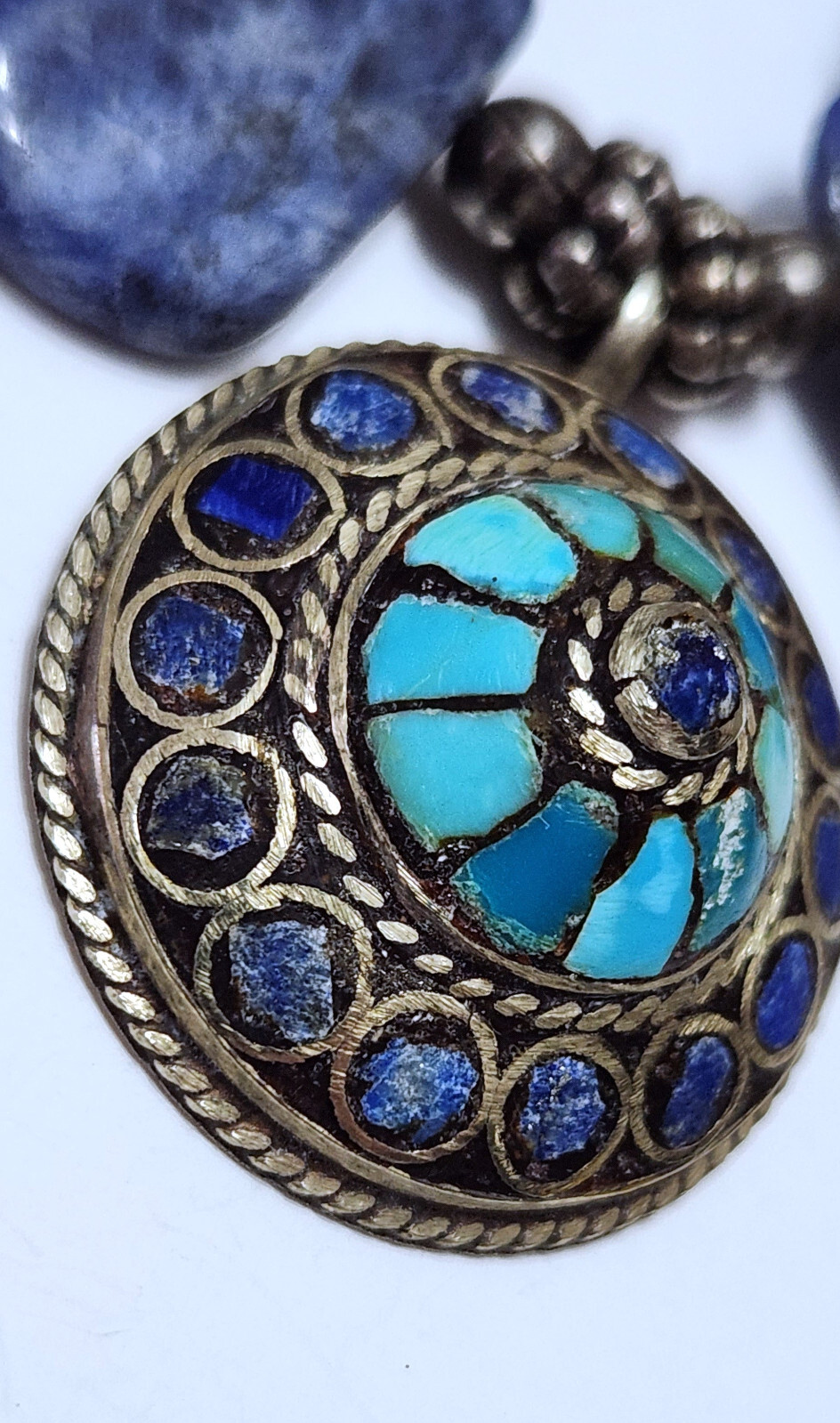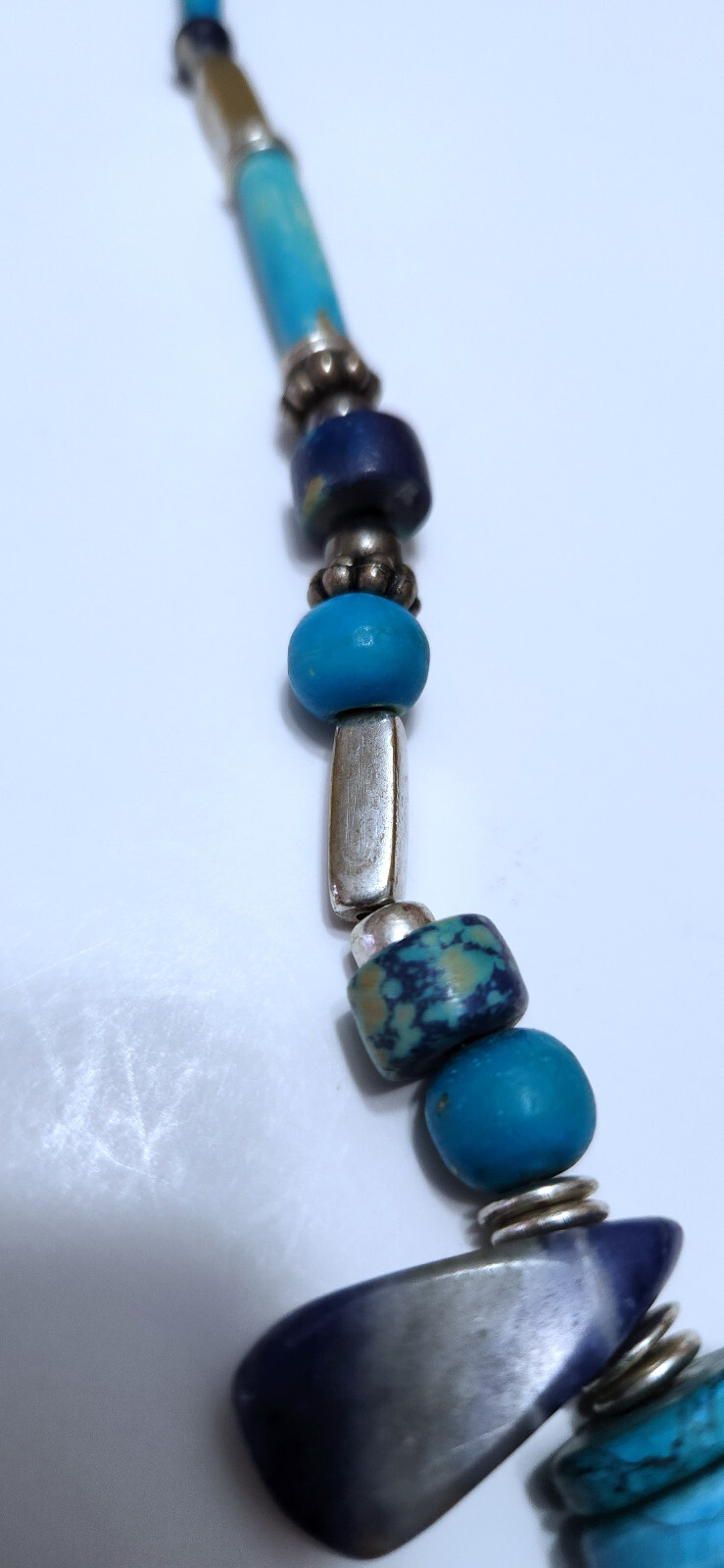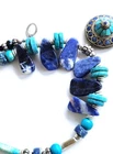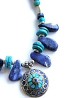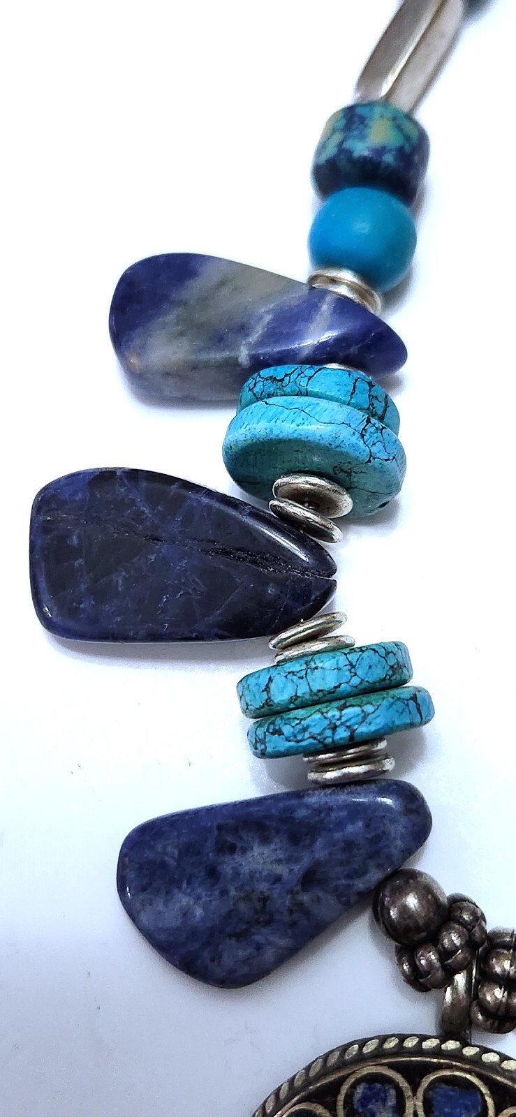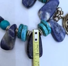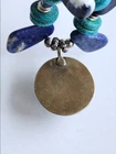Stunning handcrafted 24" long necklace. * Six various tones of 1" gems * 4 pairs Turqoise colored thin d onut beads * 4 Turqoise colored round beads * 4 dark blue thick donut beads * Barrel clasp Round Pendant has 14 stones - 10 are T urquoise colored. One other stone sits at top center. Pendant is round in gold tone "rope" design. Necklace has stones separated by other non precious stones and silver colored non precious metals. Weighs 4oz. At time of purchase, I was told the stones were Howlite &Sodalite. I CANNOT vouch for this and will not say that they are. I have no idea, but I will say the necklace is very attractive. Will compliment many styles! All offers considered. Send yours, I may accept it! Fast shipping from Miami, FL. While you're here, check out my other items for sale. Follow me...you never know what I'll be listing next! Thanks for stopping by!