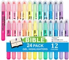 24 Pack Gel Highlighters, 12 Assorted Colors Bible Highlighter Markers Journaling Supplies, No Bleed Through For Highlighting Journal School Office Feela 24 Pack Gel Highlighter set is packed in a see-through and portable pouch. 12 colors in all and every color has 2 duplicates. Twist-up design reduces breakage of gel inside and remains clean under the protection of plastic shell and also facilitates use. No bleed through. Won’t smear over other ink. Secure to any paper surface. Conforms to ASTM-D4236. Smooth gliding offers you a joyous using experience. Acid-free and non-toxic release your concern about security.