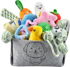 [Great Value Dog Toy Set] 23PCS puppy toys and a square dog toys storage bin. List: 7 dog rope toys, 3 rubber chew toys, 1 small dog squeaky ball, 6 plush squeaky dog toys, 1 dog bell for training, 4 rolls dog poo bags, 1 poo bag dispenser and 1 square dog toys storage bin [One Set for Satisfying Multiple Needs] For puppy teething, teeth cleaning, interactive tossing and fetching games, tug of war, dog training, dog toys storage and cleaning up dog waste, etc. Save your time & Save your money & Satisfying you and your fur-friend [Organizational Solution for Home] Stow your dog's things together to avoid mess and loss; In addition to storing dog toys, the felt storage basket can also be used to hold dry dog treats, leashes, collars, toys, blankets, outfits, grooming supplies and more [Take Good Care of Puppy] Developing good habits starts with your puppy! Prevent future furniture tearing and oral problems by using these toys and training bells to help your dog de-stress and play while developing good, healthy habits [Warm Tips for This Dog Toy Set] Our dog chew toys are rigorously tested for quality and safety; Please note that these toys are not suitable for aggressive chewers, we recommend supervised play and timely replacement of broken ones Product Description Just Get It And Have Fun! LECHONG 24pack Small Dog Toys This dog toys bundle include 24 most popular small dog chew toys, rubber toys, rope toys and squeaky toys. A great value set. SQUEAKY DOG TOYS FOR SMALL DOGS those squeaky toys are perfect size for small dogs, and bi-bi sound is more attractive to dogs. Soft surface won't hurt dog teeth, three layers of thickened fabric for extra bite resistance FUN OUTDOOR GAME Those dog toys not only can provide hours of fun, but also can help dog clean their teeth. by chewing those toy, your dog's gums are massaged, making them more capable of maintaining a healthy mouth. DURABLE ADN TOUGH DOG RUBBER TOYS Come with some pink dog toys, made form natural rubber, safe for your dog to chew. and those rubber toys are made to last, can stand with dog's sharp teeth. But not recommend for aggressive chewers. Dog Toys Set for Starter Perfect Gift for Your Fur Friends If you just got a puppy, then this puppy playset is perfect for you. He includes the puppy's favorite toys and has 4 rolls of poop bags and a training ringer. Perfect for starter. What are the products included in this dog toys set? This dog toys set include 7 dog rope toys, 6 dog squeaky toys, 4 TPR rubber dog toys, 1 training bell, 4 roll poop bags, 1 poop bag holder and 1 toy storage box. What are the dimensions of this toy organizer bin? 11*8.6*7.8 inch (28*22*20 cm) What breed of dog is this playset for? This dog toys pack is suit for smalld dogs, like Chihuahua , Pomeranian Corgi .etc