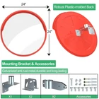 24" Security Mirror PC Convex Traffic Mirror Wide Angle Curved Safety Mirror Circular Pole Mount w/Adjustable Bracket for Outdoor Indoor Driveway Road Shop Garage Parking Lot Blind Spot Hidde Unbreakable Lens:Curved security mirror is made of shatter-proof Polycarbonate which is sturdy but lightweight!The impact resistance of polycarbonate lens is about 30 times stronger than the same thickness of acrylic or glass!Won’t broken easily when hit,PC lens will bounce back to its original shape when pressure is gone.Features excellent weather resistance,can withstand the harsh elements and conditions,extremely high or low temperature,such as rain,snow,strong wind,direct sunlight Excellent Visibility:Compared with glass or acrylic materials,polycarbonate lens provides you more clear visibility without distortion or glare!Choose the size that best suits your needs!The appropriate mirror size is dependent on how far it will be from your 24 inch diameter is great if the mirror is 5 to 35 feet away from your is an optimal size suitable for both indoor and outdoor!Perfect for places with high-traffic zones or intersections,shopping centers,main road,garage Wide View & Fully Adjustable Angle:Hemispherical safety mirror provide you with unparalleled wide view of any areas that requires frequent monitoring,let you won't miss a blind spot,thus enhancing surveillance and improving security!The special swiveling bracket allows you to tilt the traffic mirror up and down or swivel it left and right to achieve your preferred position or angle Pole-Mounted & Wall-Mounted:Our safety corner mirror comes with necessarily mounting bracket & accessories which are made of galvanized anti-rust metal,enable you to mount it on any flat surface,like wall,ceiling,or all kinds of poles,such as sign posts,tele is compatible with most materials of surfaces,such as metal & aluminum surfaces,wood & drywall surfaces,concrete & brick surfaces,could be installed to any places with poor visibility to reduce blind spots and increase safety Robust ABS Back Panel:Our security mirror is equipped with an injection molded plastic back which is not easy to broken or deform even against hard knocks and grade waterproof-rated construction,makes the safety traffic mirrors last a long service life even in harsh environments such as beaches,coast roads,ports and areas of high rainfall.Featuring an integrated sun visor on the top of the road safety mirror to block the sun,rain,snow,dust,ensure clear visibility in all conditions See More Worry Less:By eliminating blind spots and enhancing visibility,our adjustable driveway mirror plays a pivotal role in reducing collisions and accidents in high-traffic zones;assists drivers in driving more safely,backing out of driveway confidently,detecting oncoming vehicles or pedestrians in time at the corners;works perfectly to help you safely park in garages or parking lots;helps to deter thieves and improve security by monitoring of shops,stores,mini markets,kiosks and booths Eliminate All Blind Spots:Our convex safety mirror is a must-have addition to your security system,which is great for both outdoor and indoor,perfect for personal and professional use!Using it in any places which require wider field of view for increasing visibility and enhancing security,such as garages,parking lots,warehouses,factories,industrial loading docks,offices,workplaces,hospitals,schools,driveways,streets,main roads,alleyways,intersections,crossroads,high-traffic zones,shops,stores A Wide Range of Uses: As a garage mirror,allow safer entry and exit from the parking garages and driveways. As a parking assistance in parking areas to help you back up and park your car in the right place As a driveway mirror to extend the view to see around obstacles for safety at confusing corners that there is high risk of vehicle conflicts As a surveillance system in shops,supermarket,kiosks to observe the cash register or any other blind corner to prevent robbery As a monitor to monitor factory workers and automated processes to improve quality control and productivity Suitable for outdoor traffic applications and indoor use in shops to prevent theft Increase visibility and safety in a variety of location,like street corner,hallway intersections,sharp turns,narrow roads,supermarket,stores,parking lot,garage,driveway, driveways and any other indoor areas The advantages of Poly Carbonate impact resistance and shatterproof is about 30 times stronger than the same thickness of acrylic. the mirror is hit by an external force,the lens will sag,but after the external force is withdrawn,the lens will immediately return to its original condition,eliminating the defect that the highway corner mirror is easily broken by an external force. 3.Withstand the harsh temperature from -40℉ to 257℉ without break or melt 4.Excellent light transmittance: PC possesses transmissivity of over 90%, rivals glass. 5.Compared with acrylic,polycarbonate lens have excellent ltraviolet-proof properties,will reduced yellowing and atomization,maintain good light transmittance when exposure to sunlight for long time soft,lightweight but durable than acrylic 7.Excellent fire resistance Specifications: Diameter: 24"\30" Material: Shatterproof PC + ABS Weight:14lb\18lb Color: Orange Package Contents: 1x Convex PC Mirror 1x Mounting Bracket Kit.