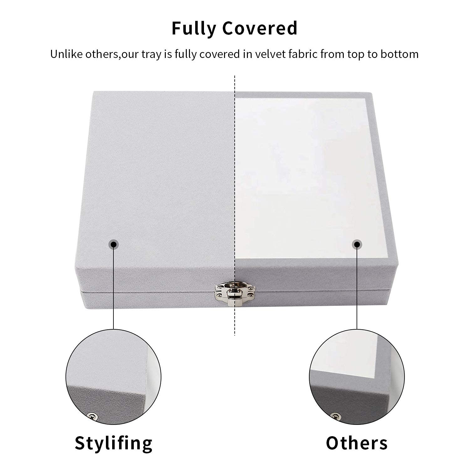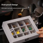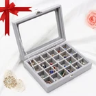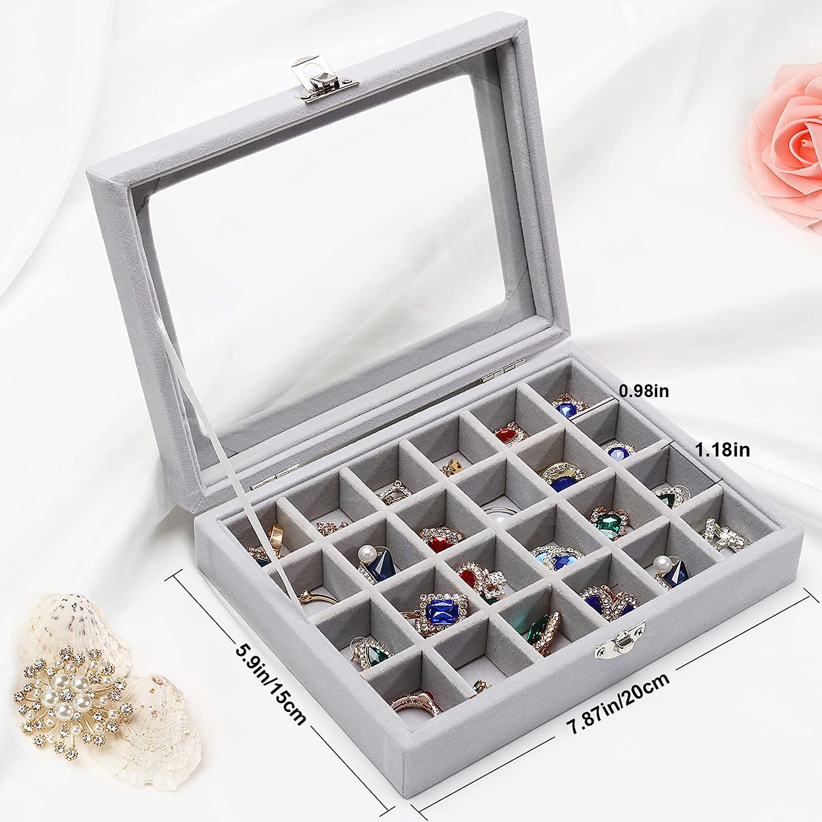 【High Quality】: The jewelry box constructed with composite board wrapped in velvet, glass lid to protect your jewelry, adjustable compartment dividers can different jewelry. 【Perfect Design】: This 24-grid jewelry display case can rings, earrings, necklaces, bracelets, cufflinks, brooches, pins, watches and more, fit in drawer and save space, size:7.87 x 5.9 x 1.77 inches. 【Lid & Lock】: This earring organizer features a glass lid that enables clear display of your jewelries while keeping them. Complete with 1 integrated safety lock for added security. 【No More Rush Morning】: Clear lid bracelet box can keep all your jewelry display in one place. you don't have to search for jewelry every morning, pick out the beloved jewelry at a glance. 【Ideal Gifts】: The small jewelry organizer for drawer is great for personal use at home, a great gift for your friends and family, and perfect for a countertop jewelry display in stores or trade shows.
