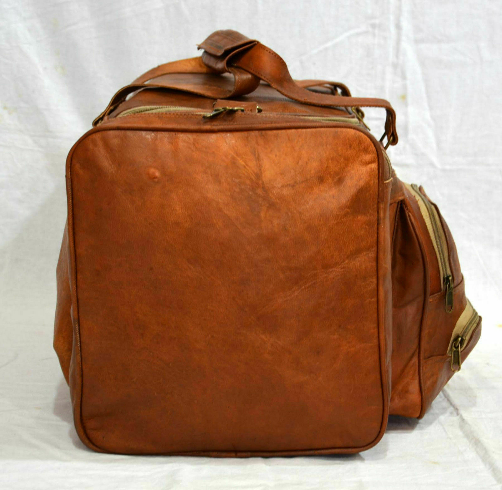 Description Handmade Goat Leather Duffle,Travel,Gym & Weekend Bag QUALITY LEATHER BAG Each bag is individually made using goat leather by experienced crafts people .The bag gets better and better with the time as the leather softens and deep-ens in color. The tonality color of each bag might vary in accordance with the low and high temperatures from the heart of The Thar desert.The leather does not receive any chemical treatment. On the bags a special vegetable oil is applied to give more tonality to the dominant brown (light and dark) color of the bag also making it more resistant to the water.Each bag has its charm and style and a very special earthy smell that will assure you it’s real leather.Its lightness, flexibility and durability will not make you regret your purchase. HANDMADE DUFFLE,TRAVEL,GYM & WEEKEND BAG Perfect bag for travel,gym & for weekend Features Green canvas fabric Internal 1 large compartment 1 big pockets on front of the bag 2 outer side pocket Thick adjustable strip SIZE: 24 (long) x 9 (wide) x 9 (deep) (See the picture for more detail) Strong, light-weight goat leather, tanned without the use of chemicals Leather softens and darkens with use Color and texture of the leather varies Natural real leather smell, just like a luxury car or lounge suite Solid brass buckles and fixtures - will last for years Has a wonderful natural look, and feel Each bag is uniquely individual due to slight color and marking variations on natural leather Brand New Handmade Leather Bag without tag Payment Using Paypal is the simplest and easiest way to pay, and is the way we prefer, but if you have a reason that you don't want to use Paypal that's OK, we will accept credit card payments and bank deposits, please contact us to arrange these after purchasing. we know that you will want to get your goods sent quickly so please remember to make your payment quickly after purchase, and we will dispatch within one business day after you have made your payment. if you need a bit of time to make your payment, that's also oke, please contact us to advise how long you need, we are happy to hold your goods for up to week before you pay. if you are purchasing from overseas,please be aware that we can only accept PayPal. Shipping Combine shipping (Heavy discounts) available Tracking details are available Express delivery (3 days) available on minimal extra charges, please write to us Shipping Partners - DHL, FedEx, UPS etc and like other International Courier Service providers only Shipping may be influenced by holidays, public events and/or any other uncertainties. We can not guarantee the exact arrival time.Please understand we could not control how the customs work at destination.If you are very care about the seemingly shipping time, please provide your contact numbers. We ensure to keep it confidential. Terms Of Sale Returns accepted Please write to us before returning the item Buyer should contact us within 20 days of receiving the item Refund will be given in refund or replacement on buyer's choice. Return shipping will be paid by the buyer Item must be returned in its original condition Please write to us for any clarification on RETURN POLICY About Us Namaste........ We are manufacturer and wholesaler of leather goods and specialized in Office Briefcases, Office Bag, College School bags, Travel Bag, Handbags, Purses, Wallets, leather journals and diaries and many more. We use quality leather of Goats and Camel. We offers customize designing and wholesale prices for bulk order. For more details, please write to us. Please visit our store and have a look of our other items If anything unanswered, please do write to us. Happy Shopping!!