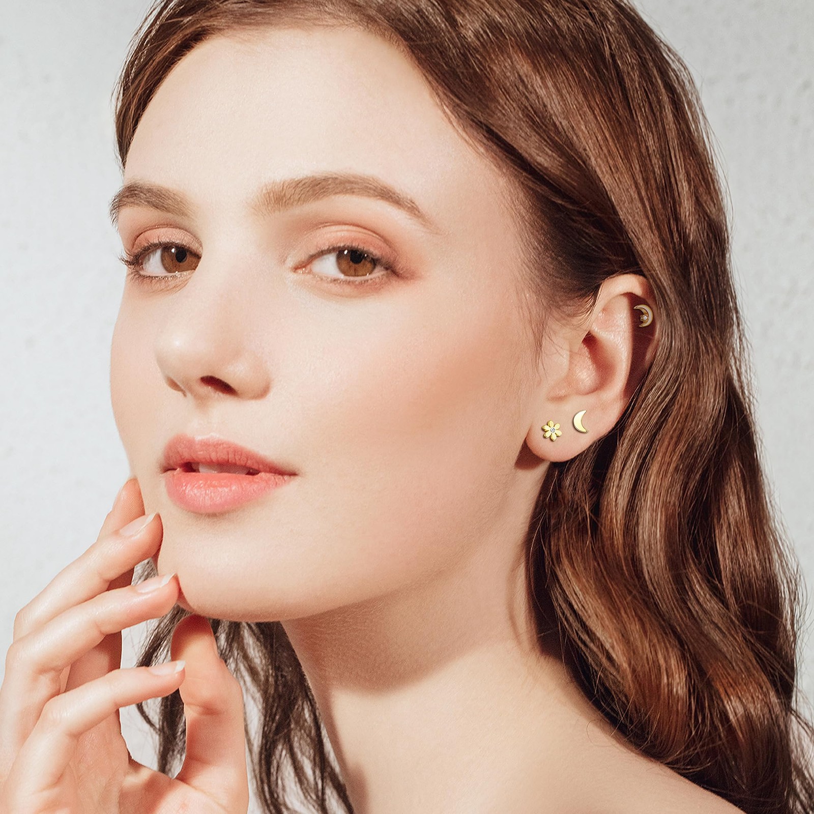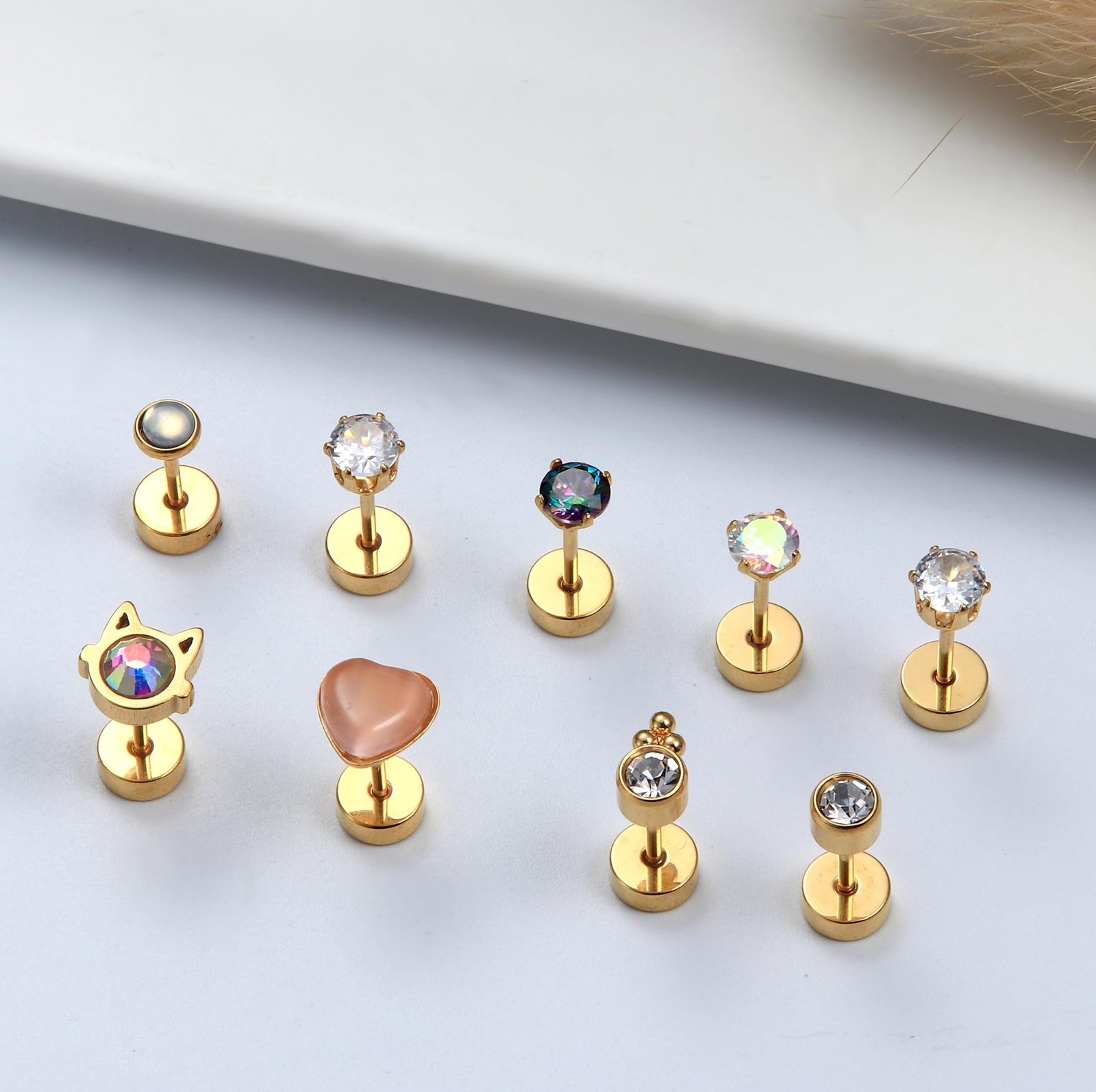 Company and Brand Introduction: :Beauty In Your Life. #.As one of the fashion jewelry brand,carry on with the tradition hand make. #.Focus on contemporary fashion jewelry design. #.Stick to the use of high quality materials About : Under the Exquisite Craftsmanship and the strict quality control of the product,we have the confidence that our jewelry is going to be your must-have jewelry in your box. Care Tips for your Jewelry: 1.Keep away from chemicals,sweat,bath,crash to avoid any damage. 2.Rub your Jewelry with wipes to bring back the shine. 3.your Jewelry separately to avoid the scratch. Flat Back Earrings Set --You will get 24 pcs(not pairs) flat back stud earrings in different style.There are CZ butterfly screw back earrings, star cartilage earrings, pink heart nap earrings, flower flatback earrings,etc.You can change different styles as you like to match your different clothes.Good value and deserve to buy Stylish Design --Do you often feel that stud earrings are too ordinary and not outstanding enough?We need more surprises and differences.The delicate flat back earrings set with Various Elements,1 set contains all the shapes you want.Can fully show your personality, while making you eye-catching in the crowd Surgical Steel Earrings for Sensitive Ear --The hypoallergenic nap earrings are made of 316L surgical stainless steel and AAA Shiny Cubic Zirconia and moon stone well inlaid,rust resistant and shiny enough,prevent you from getting stabbed and you can wear them to sleep safely,more hypoallergenic, you don't have to worry about your sensitive skin being irritated More Uses --This piercing earrings set can be used as tragus piercing jewerlry , cartilage earring, helix earrings, ear lobe earrings etc。 can not only meet your personal needs, but also be given to family, friends and lovers as exquisite presents Size --Flat back Earrings Gauge:20G(0.8mm) , Post Length:6mm,Flat Back size:4mm.The diameter of dot/3 colors CZ/moon stone:4mm,Pink Heart stud earrings:7*7mm, star/flower/moon hypoallergenic earrings:5mm, bar earrings:2*8mm, butterfly:5.5*8mm, feather:3.5*8mm.Can be worn alone or in multiples, Perfect for your party, birthday, celebration, date, shopping Care Tips for your Jewelry:1.Keep away from chemicals, sweat, bath, crash to avoid any damage.2.Rub your Jewelry with wipes to bring back the shine.3.your Jewelry separately to avoid the scratch