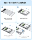 2024 New Sliding Hard Drive Enclosure: Step 1 slides the enclosure open, step 2 places the hard drive into the hard drive enclosure and pushes it firmly in place, step 3 slides the enclosure closed along the cover tracks. Tip: When removing the hard drive, lift up along the bottom groove to remove the hard drive. Super Speed 5Gbps & UASP: Hard drive enclosure with USB3.0 high speed transfer supports 5Gbps transfer rate and UASP+TRIM dual acceleration protocol, 900% faster than traditional USB 2.0, transfer HD movies, music and data in 3-4 seconds. Transparent Anti Drop Design: Clear hdd/ssd enclosure allows direct view of internal hard drive,high quality PC + ABS material shell effective anti drop and anti shock, in addition to the built in EVA sponge can ensure that the hard drive and the SATA interface stable connection. Upgrade Intelligent Chip: The external hard drive enclosure enclosure adopts a high performance chip with fast recognition, stable reading and equipped with automatic hibernation function, providing over current, over voltage and over heat protection to ensure transmission safety. Universal Compatibility: This external ssd/hdd enclosure is designed for 2.5 inch 7mm/9mm SATA hard drive and SSD up to 4TB. Compatible with Windows, Linux and Mac OS and above and compatible with Western Digital, Toshiba, Samsung, Kingston, Crucial, Hitachi hard drives, etc. Widely used in PC, Laptop, Xbox, PS5/PS4/PS3, Router and so on. (Also backward compatible with USB 2.0 or 1.1) Easy to Install and Use: This external hard drive case is tool less installation, plug & play, no driver required. Supports hot swappable, no extra power supply required. Equipped with LED indicators to easily show the working status.
