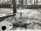 25 Mar 1945 Photograph Young Boy Pushing Lawn Mower Hat Sandbox S1324