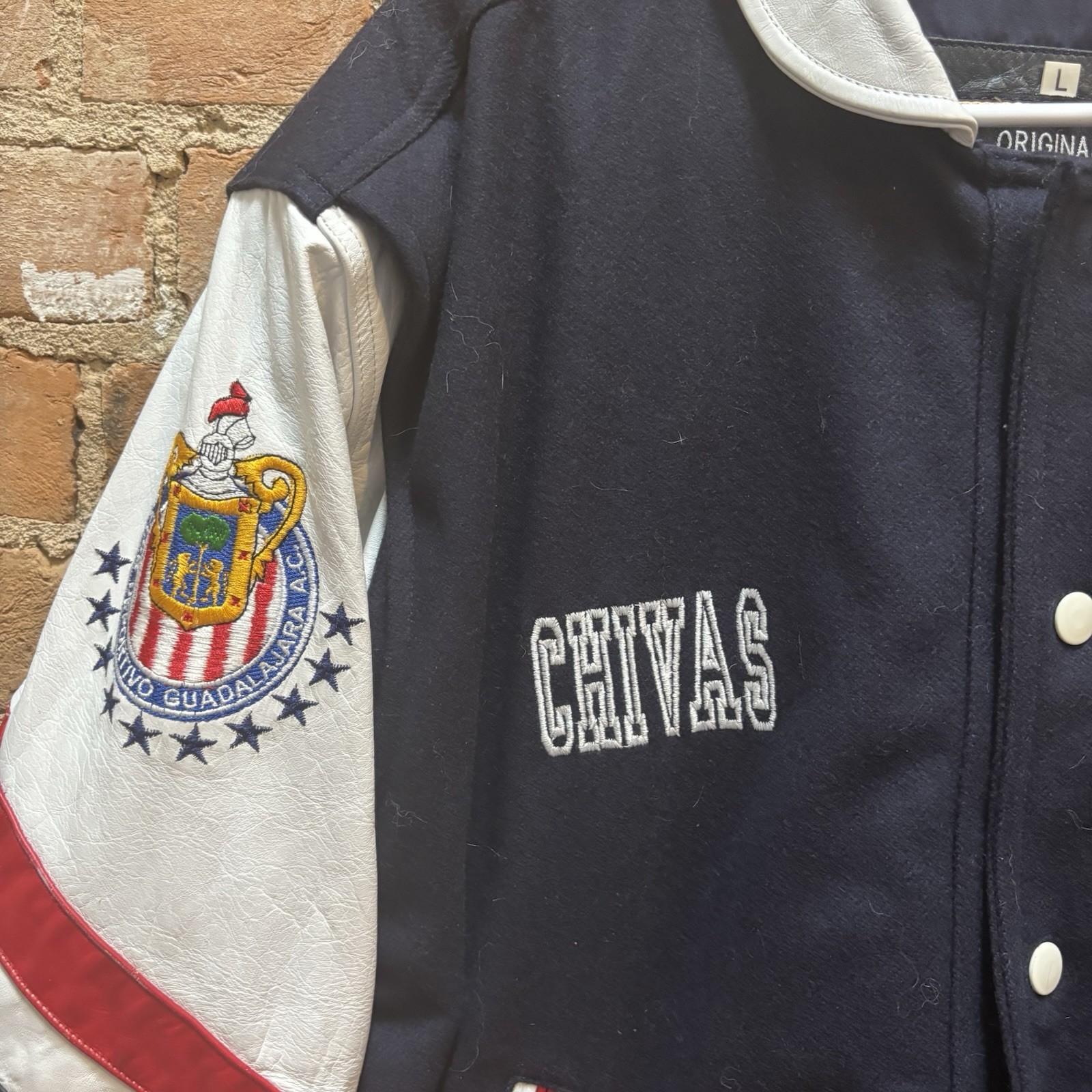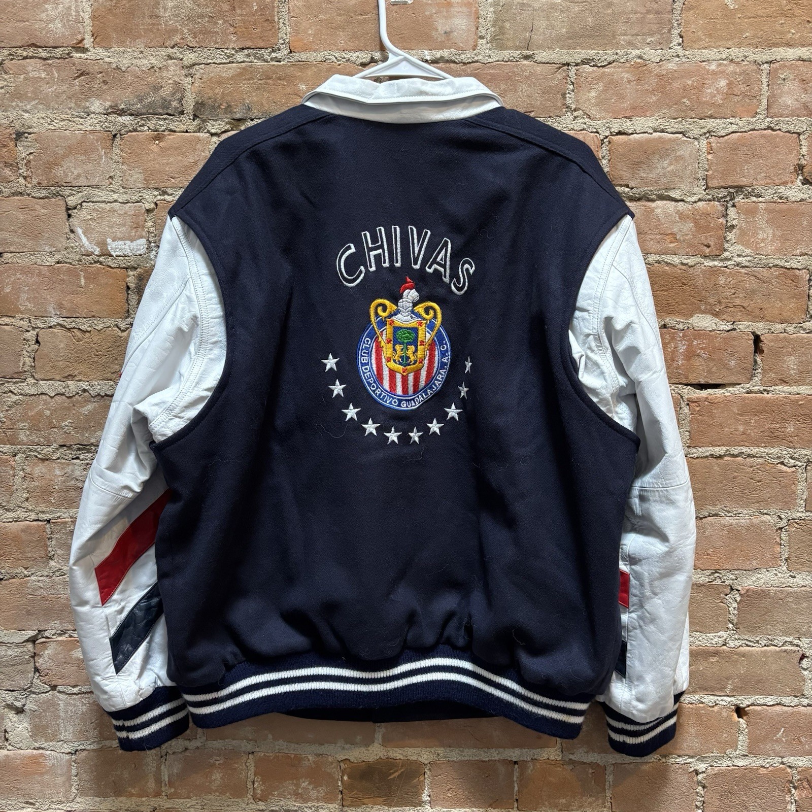 $250 Vintage 90s Chivas Guadalajara Jacket Size: large Condition: good 27 inches long x 26 inches wide This Vintage 90s Chivas Guadalajara Jacket by Mr. d’roan is a stylish and unique outerwear piece perfect for men. Made from polyester with a zip closure and machine washable for easy care, this blue jacket features the iconic Chivas Guadalajara logo as accents. The varsity style and 90s sports theme make it a standout addition to any winter wardrobe. With a size L and regular fit, this jacket is ideal for soccer enthusiasts looking to stay warm and stylish during the colder months.