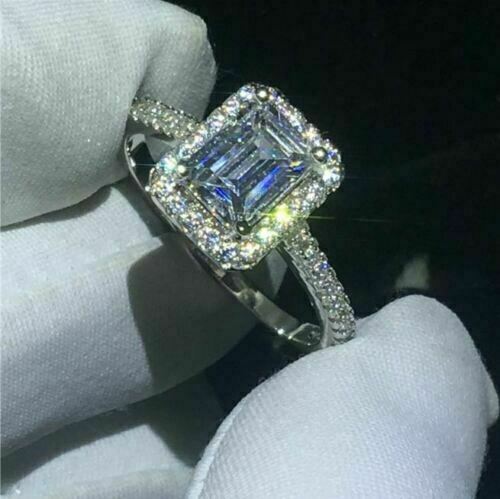 $ 53.432 Carat Simulated Emerald Diamond Halo Engagement Ring in White Gold Plated Silver