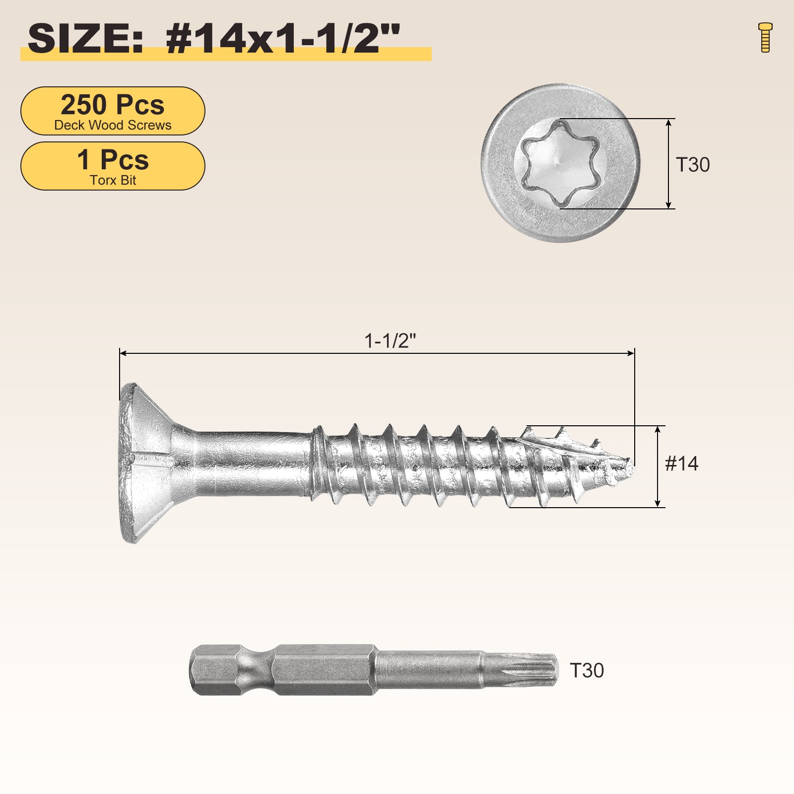 Document APPLY TO - This versatile deck screw is suitable for a wide array of wooden applications, including but not limited to patios, fences, frames, farm structures, ladders, outdoor furniture, pet houses, doors, tables, chairs, shelves, and workbenches. SPECIFICATION:Screw Size: #14x1-1/2"(Thread Dia x Length)Tail Type: Type 17Slot number: T30Color: SilverMaterial: Carbon SteelQUANTITY INCLUDED - 250Pcs x Deck Wood Screws; 1Pcs Torx BitADVANTAGE - Constructed from carbon steel with an advanced anti-corrosion treatment, these screws exhibit superior resistance to rust and corrosion. They have been tested for 1000 hours under salt spray conditions, ensuring reliable performance in both extreme heat and cold. This makes them highly durable and long-term use in various environments.DESIGN - The star drive design ensures a secure grip, minimizing the risk of slippage during installation and removal. The fine-point 17-gauge tip allows for effortless penetration into different types of wood, including hardwoods, softwoods, and pressure-treated materials. Additionally, the coarse serrated threads provide a robust hold, reducing board separation and enhancing overall structural stability.Note - Before purchasing, it's recommended to use a caliper to verify the correct size for precise measurements, as rulers or tape measures might not be accurate enough. Deck Screws(#14x1-1/2")250Pcs,Carbon Steel Wood Screw with T30 Torx Drive,Silver APPLY TO - This versatile deck screw is suitable for a wide array of wooden applications, including but not limited to patios, fences, frames, farm structures, ladders, outdoor furniture, pet houses, doors, tables, chairs, shelves, and workbenches. SPECIFICATION: Screw Size: #14x1-1/2"(Thread Dia x Length) Tail Type: Type 17 Slot number: T30 Color: Silver Material: Carbon Steel QUANTITY INCLUDED - 250Pcs x Deck Wood Screws; 1Pcs Torx Bit ADVANTAGE - Constructed from carbon steel with an advanced anti-corrosion treatment, these screws exhibit superior resistance to rust and corrosion. They have been tested for 1000 hours under salt spray conditions, ensuring reliable performance in both extreme heat and cold. This makes them highly durable and long-term use in various environments. DESIGN - The star drive design ensures a secure grip, minimizing the risk of slippage during installation and removal. The fine-point 17-gauge tip allows for effortless penetration into different types of wood, including hardwoods, softwoods, and pressure-treated materials. Additionally, the coarse serrated threads provide a robust hold, reducing board separation and enhancing overall structural stability. Note - Before purchasing, it's recommended to use a caliper to verify the correct size for precise measurements, as rulers or tape measures might not be accurate enough. Hot Item Payment 1.We accept eBay payment . 2.Payment must be received within 7 business days of auction closing. Shipping 1.We ship to your eBay or Paypal address. Please make sure your eBay and Paypal address is correct before you pay. 2.Items will be shipped within 1-3 business day when we received payment. 3.Delivery time depends on destination and other factors. Description Policy Deck Screws(#14x1-1/2")250Pcs,Carbon Steel Wood Screw with T30 Torx Drive,Silver APPLY TO - This versatile deck screw is suitable for a wide array of wooden applications, including but not limited to patios, fences, frames, farm structures, ladders, outdoor furniture, pet houses, doors, tables, chairs, shelves, and workbenches. SPECIFICATION: Screw Size: #14x1-1/2"(Thread Dia x Length) Tail Type: Type 17 Slot number: T30 Color: Silver Material: Carbon Steel QUANTITY INCLUDED - 250Pcs x Deck Wood Screws; 1Pcs Torx Bit ADVANTAGE - Constructed from carbon steel with an advanced anti-corrosion treatment, these screws exhibit superior resistance to rust and corrosion. They have been tested for 1000 hours under salt spray conditions, ensuring reliable performance in both extreme heat and cold. This makes them highly durable and long-term use in various environments. DESIGN - The star drive design ensures a secure grip, minimizing the risk of slippage during installation and removal. The fine-point 17-gauge tip allows for effortless penetration into different types of wood, including hardwoods, softwoods, and pressure-treated materials. Additionally, the coarse serrated threads provide a robust hold, reducing board separation and enhancing overall structural stability. Note - Before purchasing, it's recommended to use a caliper to verify the correct size for precise measurements, as rulers or tape measures might not be accurate enough. Hot Item Payment 1.We accept eBay payment . 2.Payment must be received within 7 business days of auction closing. Shipping 1.We ship to your eBay or Paypal address. Please make sure your eBay and Paypal address is correct before you pay. 2.Items will be shipped within 1-3 business day when we received payment. 3.Delivery time depends on destination and other factors.