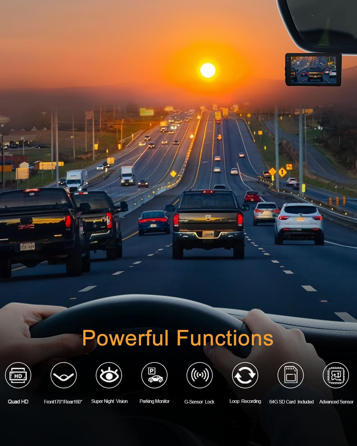 【2.5K+1080P Dual Recording】 The front dash cam adopts an amazing 2.5K resolution and the rear camera 1080P resolution to capture your driving journey. It can help you read key details such as road signs and license plates. To reduce blind spots, its front wide angle is 170 ° and the rear wide angle is 160 °. This helps you preserve and present evidence in case of unexpected situations such as collisions. 【Loop Recording&G-Sensor】 The dash cam has a loop recording feature that automatically overwrites the oldest unlocked files when your memory card is full. Equipped with an intelligent gravity sensor, in the event of a collision, the dashcam will automatically lock the currently recorded footage as evidence. Locked files will not be overwritten by loop recording. We give you a 64GB card for continuous recording. 【Excellent Night Vision Capability】 The front and rear dual recording driving recorder has a large F2.0 aperture and 6 layers of glass, WDR (Wide Dynamic Range) technology, which automatically balances exposure in extreme dark scenes, achieving excellent night vision capability and obtaining clear videos both day and night. 【24-Hour Parking Mode】 This dash cam continuously monitors your car 24 hours a day, and when your car is parked, it can automatically switch to parking mode. If any collision or sudden movement is detected, it will be automatically recorded. The delayed recording mode maintains continuous recording with minimal power consumption and low frame rates, ensuring that your vehicle is protected from theft or damage around the clock. This requires a hardwired kit (ASIN: B0D922RDXQ, not included). 【Compact and Easy to Install】 The dash cam adopts a mini and lightweight design (size: 3.4x2.0x1.4 inches), occupying very little interior space and not obstructing your line of sight while driving. Easy to install, easy to set up, plug and play, very convenient. Even first-time users need not worry.