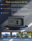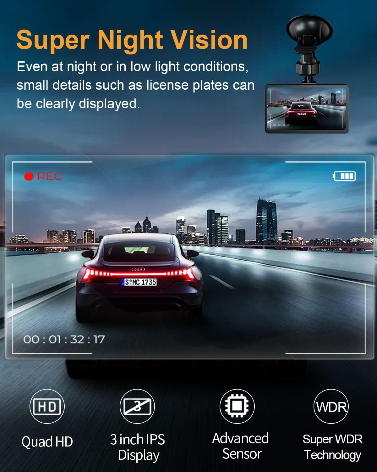 【2.5K+1080P Dual Recording】 The front dash cam adopts an amazing 2.5K resolution and the rear camera 1080P resolution to capture your driving journey. It can help you read key details such as road signs and license plates. To reduce blind spots, its front wide angle is 170 ° and the rear wide angle is 160 °. This helps you preserve and present evidence in case of unexpected situations such as collisions. 【Loop Recording&G-Sensor】 The dash cam has a loop recording feature that automatically overwrites the oldest unlocked files when your memory card is full. Equipped with an intelligent gravity sensor, in the event of a collision, the dashcam will automatically lock the currently recorded footage as evidence. Locked files will not be overwritten by loop recording. We give you a 64GB card for continuous recording. 【Excellent Night Vision Capability】 The front and rear dual recording driving recorder has a large F2.0 aperture and 6 layers of glass, WDR (Wide Dynamic Range) technology, which automatically balances exposure in extreme dark scenes, achieving excellent night vision capability and obtaining clear videos both day and night. 【24-Hour Parking Mode】 This dash cam continuously monitors your car 24 hours a day, and when your car is parked, it can automatically switch to parking mode. If any collision or sudden movement is detected, it will be automatically recorded. The delayed recording mode maintains continuous recording with minimal power consumption and low frame rates, ensuring that your vehicle is protected from theft or damage around the clock. This requires a hardwired kit (ASIN: B0D922RDXQ, not included). 【Compact and Easy to Install】 The dash cam adopts a mini and lightweight design (size: 3.4x2.0x1.4 inches), occupying very little interior space and not obstructing your line of sight while driving. Easy to install, easy to set up, plug and play, very convenient. Even first-time users need not worry. Product Description 1 Parking Monitoring 2 Gravity Sensor 3 Loop Recording