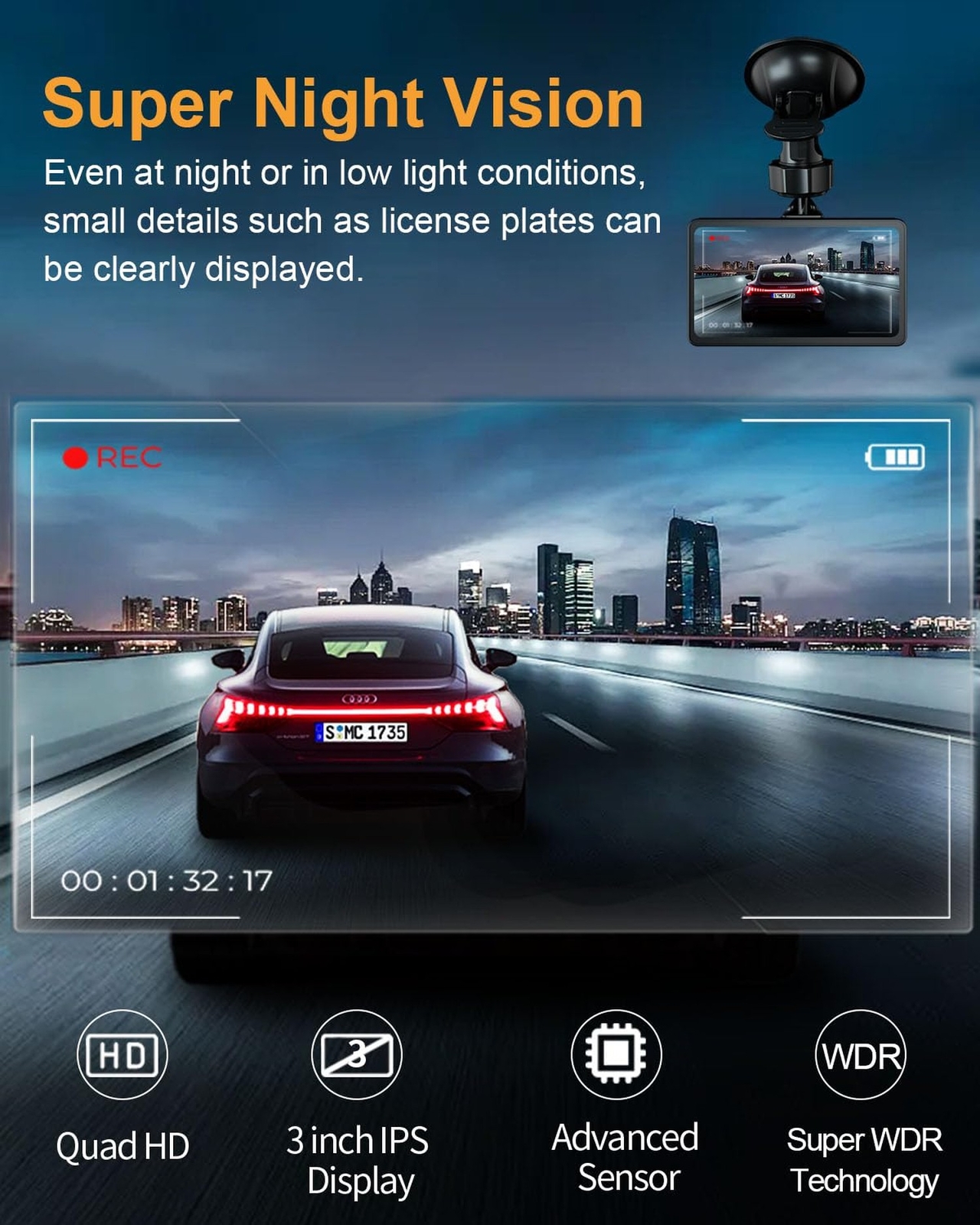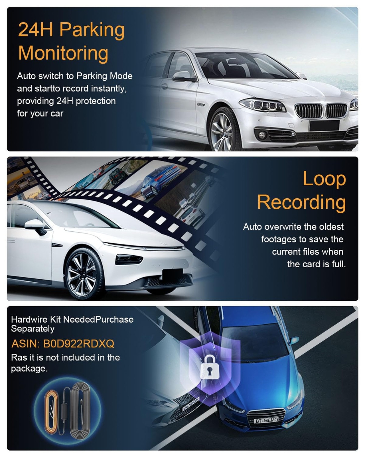 Dash Cam,2.5K Dash Cam Front and Rear,with 64GB MicroSD Card,3" IPS Screen,Dual Dashcams for Cars with Night Vision,WDR,Wide Angle,G-Sensor,Loop Recording,24H Parking Mode,Black Product Details Color: Black Brand: BTLMEMO MPN: Does not apply UPC: Does not apply EAN: Does not apply Brand: BTLMEMO Orientation: Front and Rear Vehicle Service Type: Car Connectivity Technology: Type-C Special Feature: Night Vision Video Capture Resolution: 1440p Included Components: Quick Guide Mounting Type: Windshield Mount Color: Black Product Dimensions: 3.42"D x 2.05"W x 1.49"H Product Dimensions: 3.42 x 2.05 x 1.49 inches Item Weight: 15.5 ounces Batteries: 1 Lithium Ion batteries required. (included) Connectivity technologies: Type-C Special features: Night Vision Other display features: Wireless Color: Black Whats in the box: Quick Guide Manufacturer: BTLMEMO Country of Origin: China Date First Available: July 4, 2024 2.5K+1080P Dual Recording The front dash cam adopts an amazing 2.5K resolution and the rear camera 1080P resolution to capture your driving journey. It can help you read key details such as road signs and license plates. To reduce blind spots, its front wide angle is 170 and the rear wide angle is 160 . This helps you preserve and present evidence in case of unexpected situations such as collisions. Loop Recording&G-Sensor The dash cam has a loop recording feature that automatically overwrites the oldest unlocked files when your memory card is full. Equipped with an intelligent gravity sensor, in the event of a collision, the dashcam will automatically lock the currently recorded footage as evidence. Locked files will not be overwritten by loop recording. We give you a 64GB card for continuous recording. Excellent Night Vision Capability The front and rear dual recording driving recorder has a large F2.0 aperture and 6 layers of glass, WDR (Wide Dynamic Range) technology, which automatically balances exposure in extreme dark scenes, achieving excellent night vision capability and obtaining clear videos both day and night. Compact and Easy to Install The dash cam adopts a mini and lightweight design (size: 3.4x2.0x1.4 inches), occupying very little interior space and not obstructing your line of sight while driving. Easy to install, easy to set up, plug and play, very convenient. Even first-time users need not worry.