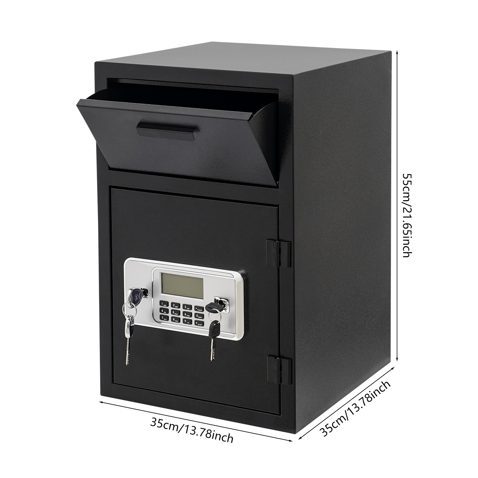 2.6 Cub Drop box Money and Mail Safe Box Sturdy Steel Fireproof Drop Slot Description A high-quality safe can enhance your sense of security even more. This safe is made of sturdy steel and has strong reliability. The sturdy anti-theft lock can protect your valuable property, and the intelligent alarm system allows you to keep an eye on its status at all times. Having this high-quality safe allows you to confidently go out. Key Features Build to Last: It is made of sturdy and thickened steel plates, and adopts laser cutting and galvanizing processes, with the advantages of high strength, wear resistance, and compression resistance, providing you with long-lasting and reliable protection. Thoughtful Design: The drop slot safe has spikes at the end and they're pretty sharp, definitely prevents nosy hands from trying to pull anything out. Large Capacity: The large size of 13.86*13.86*21.65 inches provides you with 1.31ft³ of space to help you organize important items and reduce clutter. The wide top can also be used for temporary storage of small items. Powerful Protection: The sturdy lock, thickened material, two types of unlocking keys, and high-quality lock tongues provide your valuables with anti-theft protection. Intelligent Alarm System: If the password is entered incorrectly three times, an alarm will sound and it will automatically lock for 3 minutes, while pressing the wrong key four times will lock for 10 minutes. After entering an incorrect password or being hit by a heavy object, a 60-second alarm sound will sound. An alarm will also sound when the battery is low. The intelligent alarm system enhances its security. Convenient to Use: The delivery port with a maximum opening angle of 90 ° allows you to deliver important items into the safe without opening the door, making it more convenient to use. Easy Installation: Thanks to its pre-drilled mounting holes and screws, you can mount this product on the wall or you can directly place it on the floor for more flexibility and convenience. Nice Appearance: The classic black and smooth lines give the product a sense of modernity and fashion, which can blend with most home and office decoration styles. Customer Service: Communication is the best way to solve problems. If you have any problems, please feel free to contact us. We will reply and solve the problem for you as soon as possible. Details Round Corners: The smooth corners can better ensure safety during installation and use. Practical Handle: The handle design on the delivery port makes it easy for you to open and drop items. Application It is an ideal choice for families, offices, hotels, schools, hospitals, shopping malls, banks, and restaurants to store valuable assets and belongings, such as money, check payments, files, documents, birth certificates, social security cards, coins, etc. Specification Color: Black Style: Modern Material: Steel Process: Laser Cutting, Galvanizing Shape: Rectangular Assembly Required: No Mounting Type: Wall Mount, Floor Mount Capacity: 0.037m³/1.31ft³ Steel Board Thickness: 1mm/0.04in Battery Type: 4*AA Batteries(Not Included) Product Size: 35.2*35.2*55cm/13.86*13.86*21.65in Package Size: 42.2*42.2*62cm/16.61*16.61*24.41in Gross Weight: 10.2kg/22.49lbs Net Weight: 9kg/19.84lbs Package Included 1* Safe 4* Keys 1* Spare Battery Box 1* English Manual All Accessories for Assembly Notes Please read the manual carefully before using it and pay attention to the dimensions of this safe before purchasing. It is advisable to set the combination when the safe door is open. After setting the code, you should enter the new code several times. The door can be locked after confirmation. You can change the password to their specific password after purchasing a new safe. Please refer to the manual for the change method. Please keep the spare key and spare battery box in a safe place. Please check that all keys are complete. Please do not leave large amounts of cash and valuables unattended. When moving and relocating, please do not hit the safe to avoid damage. When not in use for a long time, please remove the battery from the battery box. Please bring your own 4*AA batteries. Please allow the slight color difference caused by the shooting light and 1-3cm error due to manual measurement, and make sure you do not mind before ordering. Payment Delivery details Terms of sales About us Contact us Payment We accept ebay payment 。 Fees such as import duties, taxes are not included in the item price or shipping costs. These charges are the buyer's responsibility. Delivery details Shipping: 2-9 working days to: USA Terms of sales We maintain high standards of excellence and strive for hundred percent customer satisfaction. Feedback is very important to us. We hope that you contact us immediately before you give neutral or negative feedback, so that we can address your concerns. It is impossible to address issues if we do not know about them! About us Your satis faction is our ultimate goal. We work hard to earn your trust and future business. Our certified technicians have tested each item before shipping. The unit comes with 1 year limited warranty on all manufacturing defects. a) If you receive a defective item, you may return it or ask for a discount. Please contact us within 14 days after you receive the package. b) What you returned must be intact and in its original packaging as re? u. Customer is responsible for shipping costs of the returned item. c) We will cover the cost of shipping back t with the shipping rate indicated in the registration page. We will send you a new unit or refund the full payment you paid. Thank you. Contact us Business Hour Business Hour: Monday To Friday: 8:30 AM to 5:00 PM (Beijing China time) Due to time zones, our reply to your questions may not be immediately. But within above working time, we will reply your email within 24 hours. If it's non-workdays, please kindly be patient and wait till Monday. Please contact us with eb