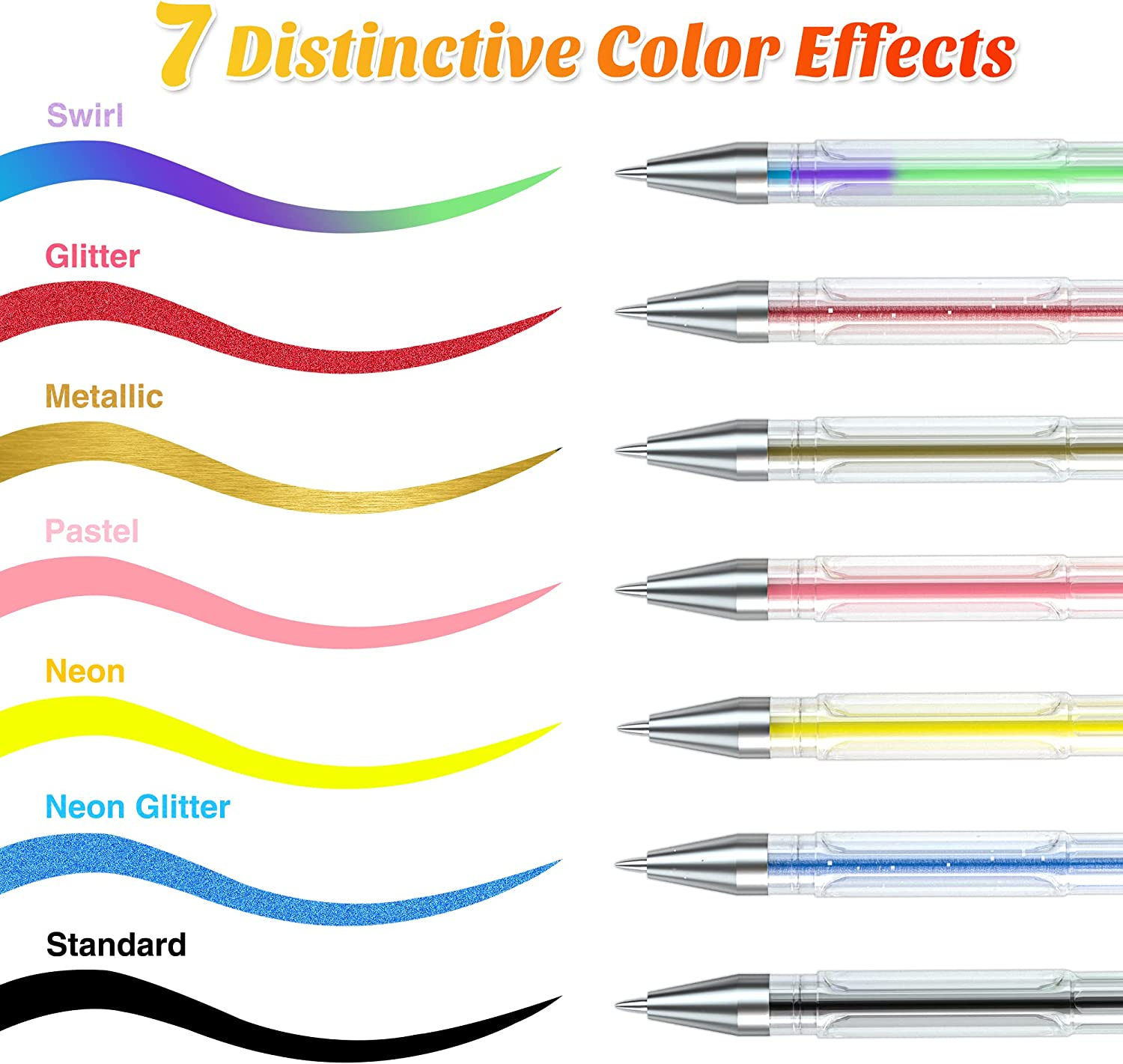 260 super valued feela gel pens pack includes 130 unique gel pen and 130 refills. Color assortment: Glitter, Neon Glitter, Neon, Metallic, Pastel, Swirl, and Standard. Suit for children and adult, great for coloring, doodling, drawing and sketching. With Color box packing, eco friendly and delicate. Tip size: 0.6-1.0mm. Super smooth writing and long lasting. Acid-free and non-toxic, conforms to ASTM D-4236. Performance&Satisfaction: We provide you with not only our high quality products but also our quick response service. Product Description