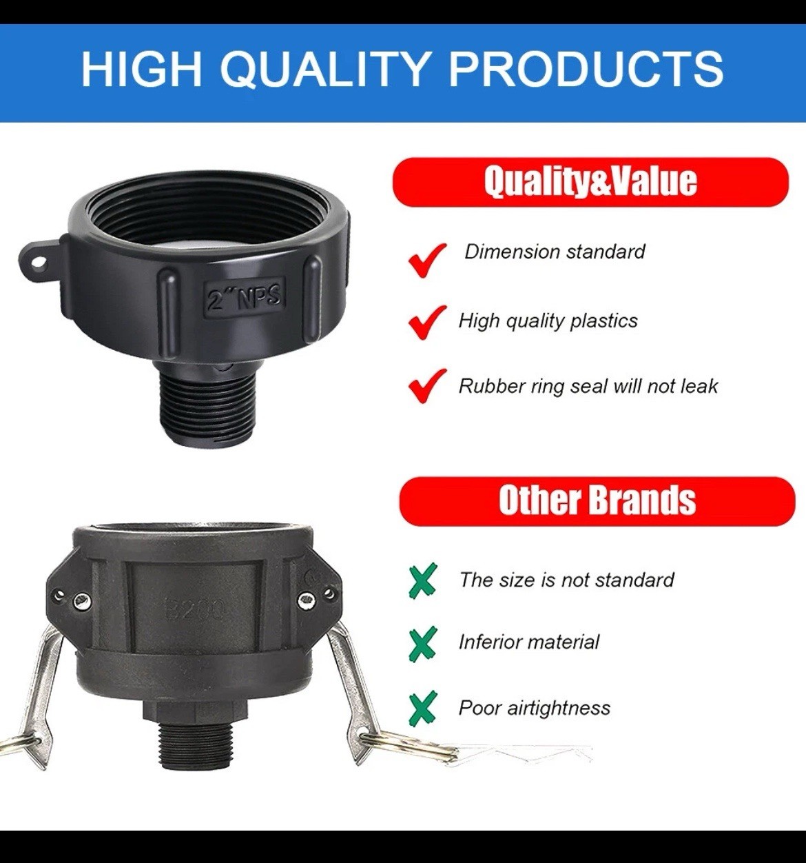 The product is a 275-330 Gallon IBC Tote Adapter Garden Hose with a 2 NPT (NPS) fine thread to 3/4 male connection. It is designed for use with IBC totes, allowing for easy connection to garden hoses for watering and filling purposes. The S60 NPS IBC Tote Water Tank Adapter ensures a secure and efficient transfer of water from the IBC tote to the garden hose, making it a convenient accessory for various outdoor watering tasks.