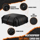 Bullet Points: Ample Cargo Possibilities: Pack all your bulky luggage with ease using our spacious car roof luggage carrier. The soft side design provides enough storage space of 28 cubic feet, perfect for those extra heavy items that won't fit in your trunk. Ideal Protection: Safeguard your items against any weather conditions with our car roof luggage carrier. Built with waterproof, high-quality material, it comes equipped with anti-scratch and sun protection qualities. Exquisite Workmanship: With protected from scratches and slips and exquisite workmanship, our car roof luggage carrier provides unmatched UV protection engineered to withstand any weather and keep your belongings safe. Effortless Setup: Seamlessly attach this Rooftop Cargo Bag to any vehicle, with or without a roof rack, and enjoy a swift, straightforward installation process that takes mere minutes. Versatile Uses: Delivering safety and convenience in equal measure, this car roof luggage carrier is suitable for all types of vehicles. Its practical design is perfect for any truck or SUV, while its compact, foldable design makes for easy storage and transport. Our car rooftop cargo carrier bag provides 28 cubic feet of storage while protecting against scratches and sun damage with anti-scratch and UV protection. With a quick and easy installation process, it's suitable for all cars. Specification: Product name:Car Rooftop Cargo Carrier Bag Colour: Black Waterproof level: waterproof Usage: outdoor products Applicable models: General Packing List: Car Rooftop Cargo Carrier Bag x1 Anti-slip mat x1 Storage bag x1 Door hook x6 Note: 1. Due to the different display and lighting effects, the actual color of the product may be slightly different from the color shown in the picture. Thanks! 2. Due to manual measurement, a measurement deviation of 1-3cm is allowed.